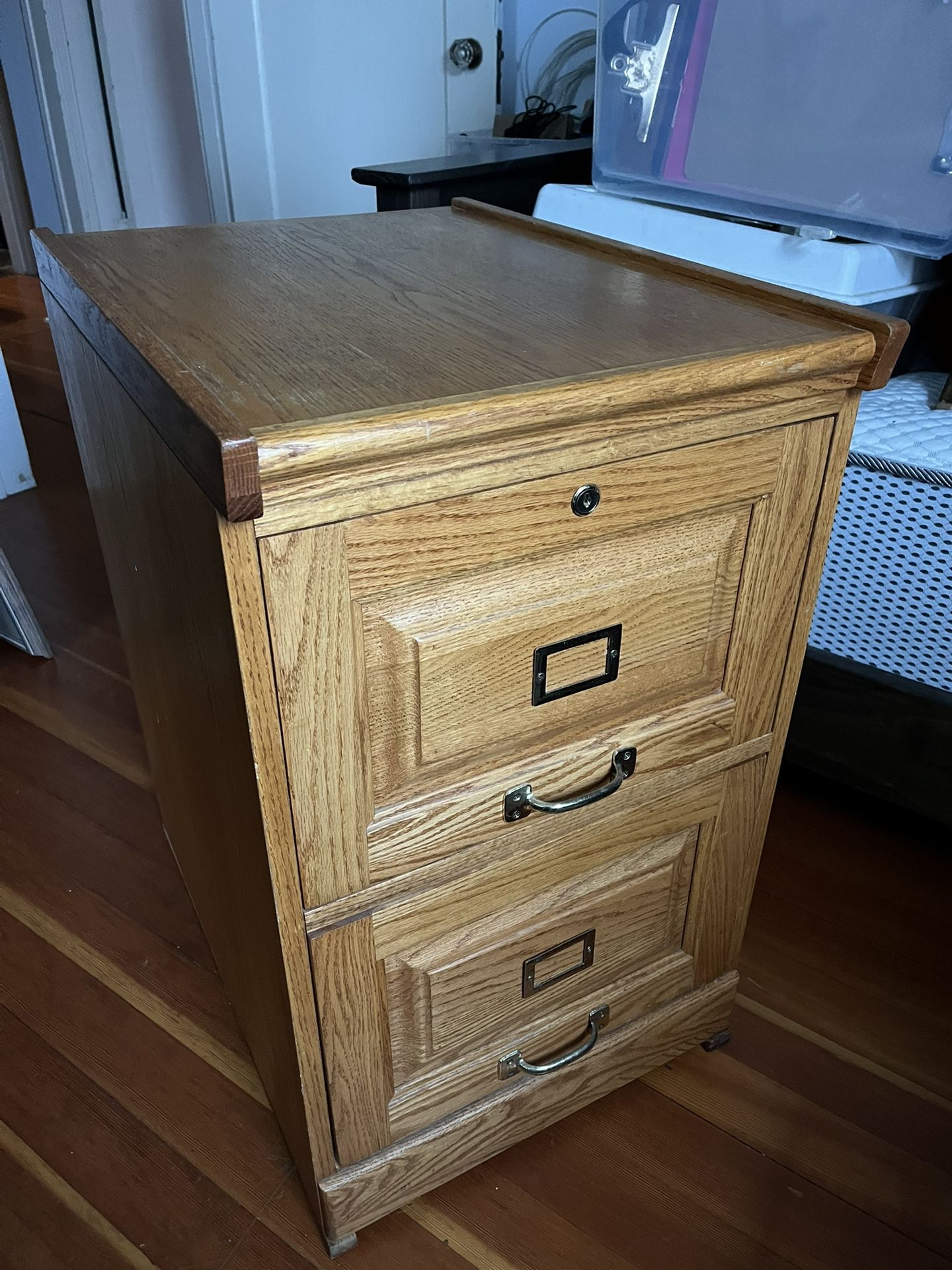 In great shape, some fading on the top and normal wear. Golden oak, has a lock but no keys. Heavy and sturdy! Measurements are in the photos.. Length - 25” Height - 30.5” Width - 18.5” I’ll throw in a bunch of file folders. Cash & pick up only! Thank you.