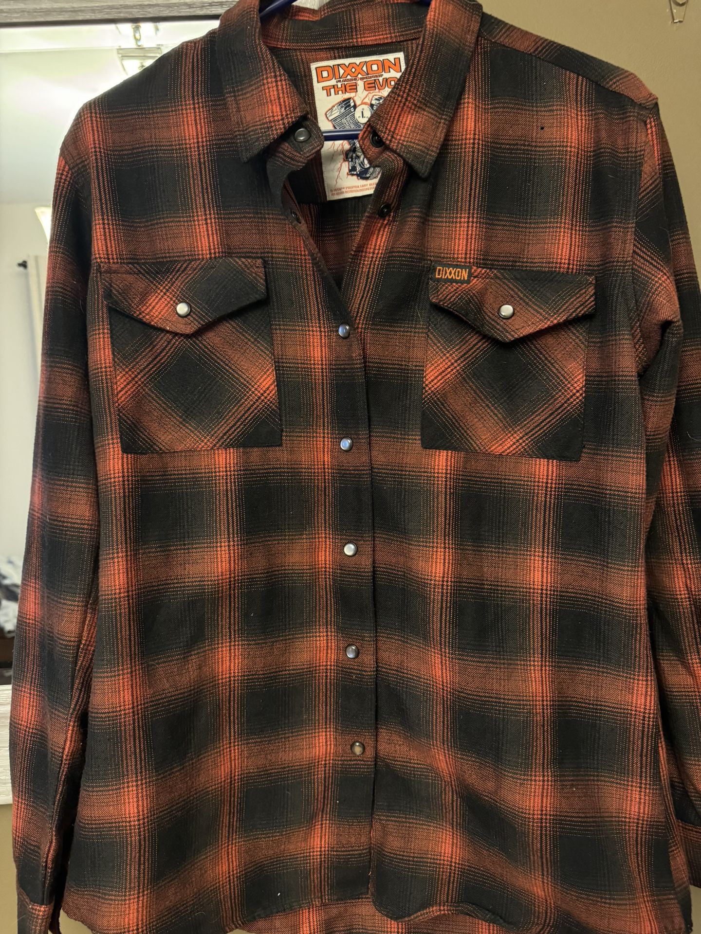 Size- Woman’s Large Color- orange and black Has one hole from a fire but could easily throw a stitch in it