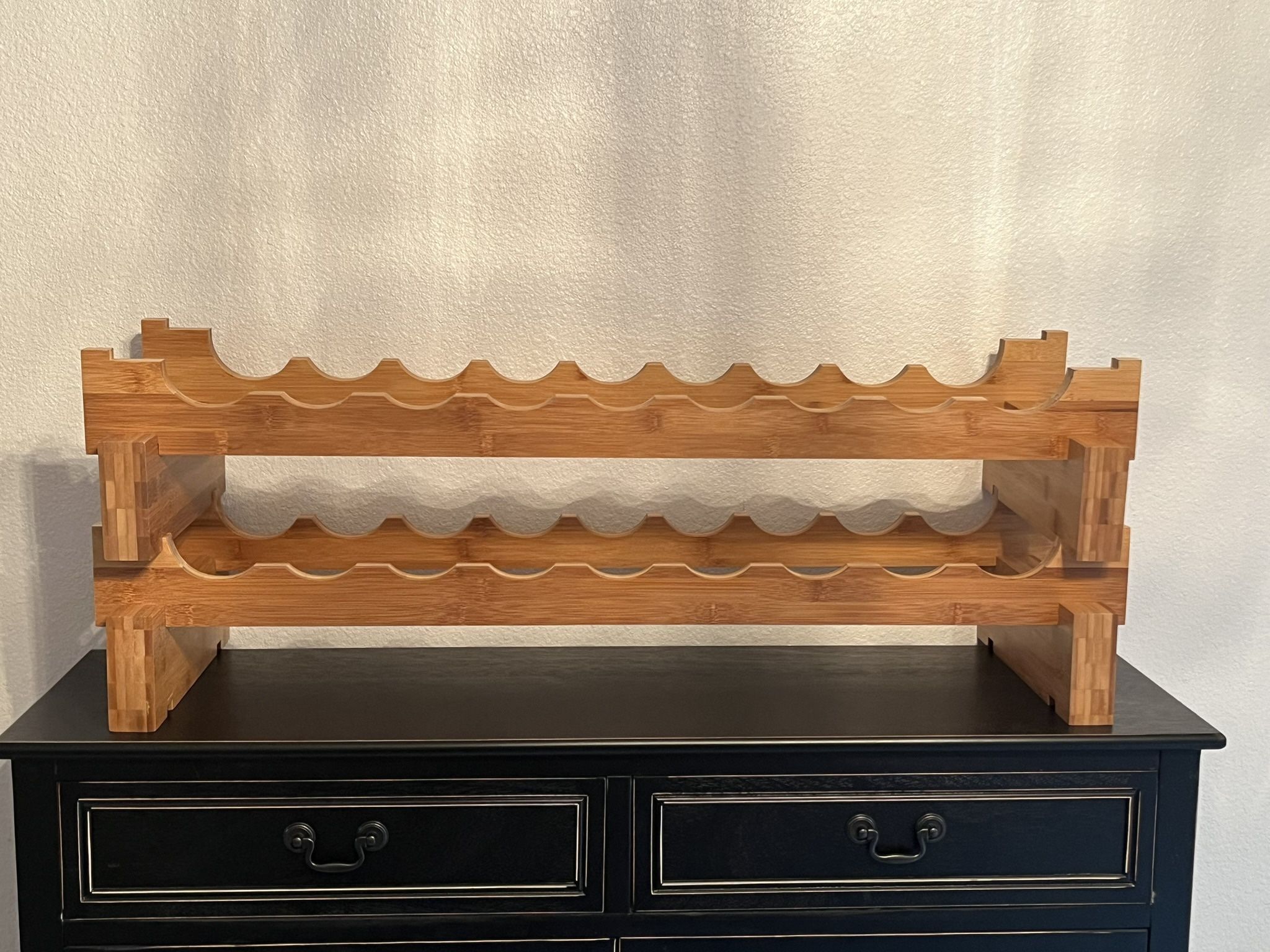 Holds 18 bottles (9 on each rack) Each rack can also be used separately Wood pieces interlock, so need for hardware or tools 34 1/4" Wide x 12 3/8" High 11 7/8" Deep Made by Oceanstar: https://offerup.com/redirect/?o=aHR0cHM6Ly93d3cub2NlYW5zdGFyZGVzaWduLmNvbS9wcm9kdWN0cy93cjEzNjE= In like-new condition From a smoke free, pet friendly home Cash only