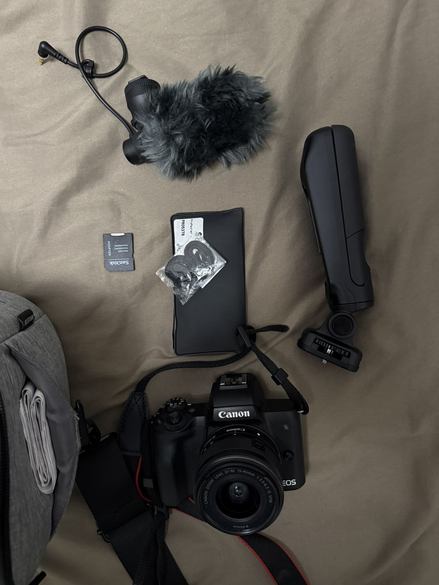 Cannon M50 mark ii Lens EF M-15-45mm 1:3.5-6.3 STM Brings MIC Cannon Tripod 3 Batteries with Charger USB-C & Or Old Samsung charger. Pro master Bag SD Card