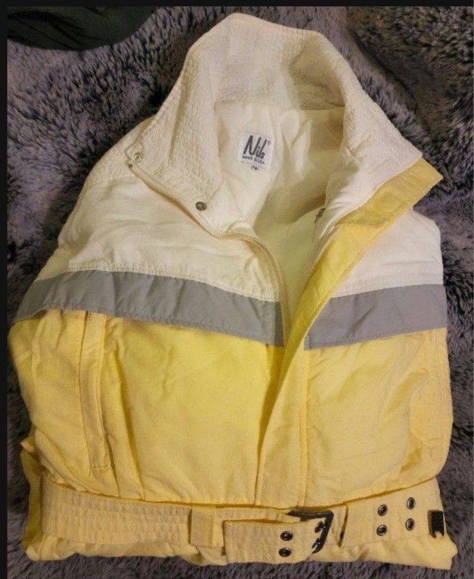 Nils Yellow, grey, white, one piece belted ski suit Size: 12 Vintage/rare. Like new condition.