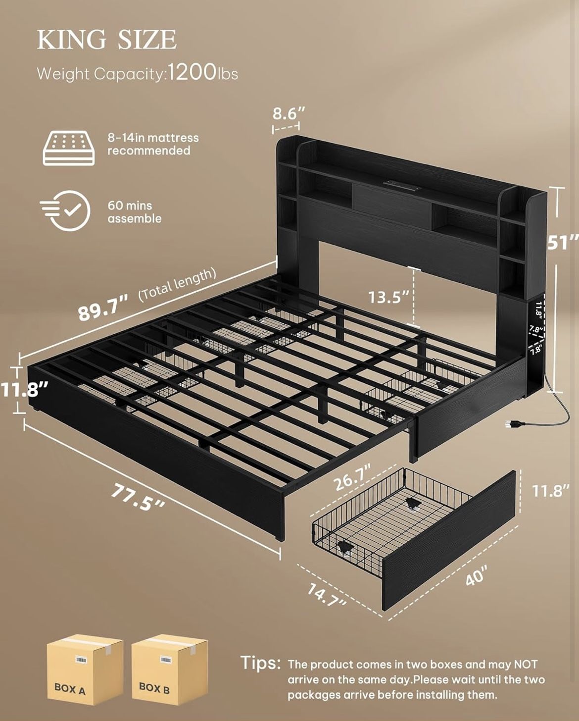 Brand new bed frame in box, just one tiny issues (one wrong piece). Hello everyone, I’m selling this brand new King Size Bed Frame with Bookcase Headboard and 4 Storage Drawers. The only issue is one of the piece to put the bed together is the wrong one, they provided two left piece instead of one right & one left. I believe someone handy could fix it, or by getting in contact with the manufacturer (Amazon) to get a replacement part. This is why I’m selling it only for $70. Thank you!