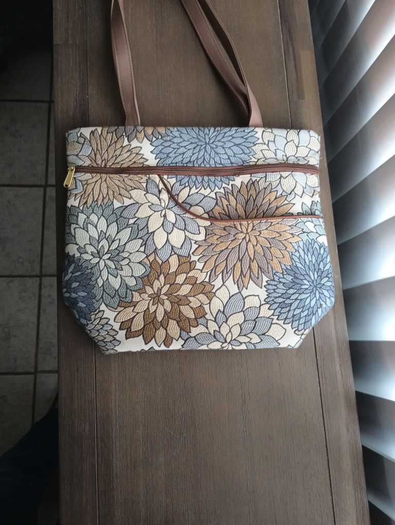 Floral Tapestry /Mumsford Blue Fabric Pattern Purse by Danny K Beverly Hills CA, Made In The USA, Large Zipper Purse 14 1/2 w x 12 l x 5 d,