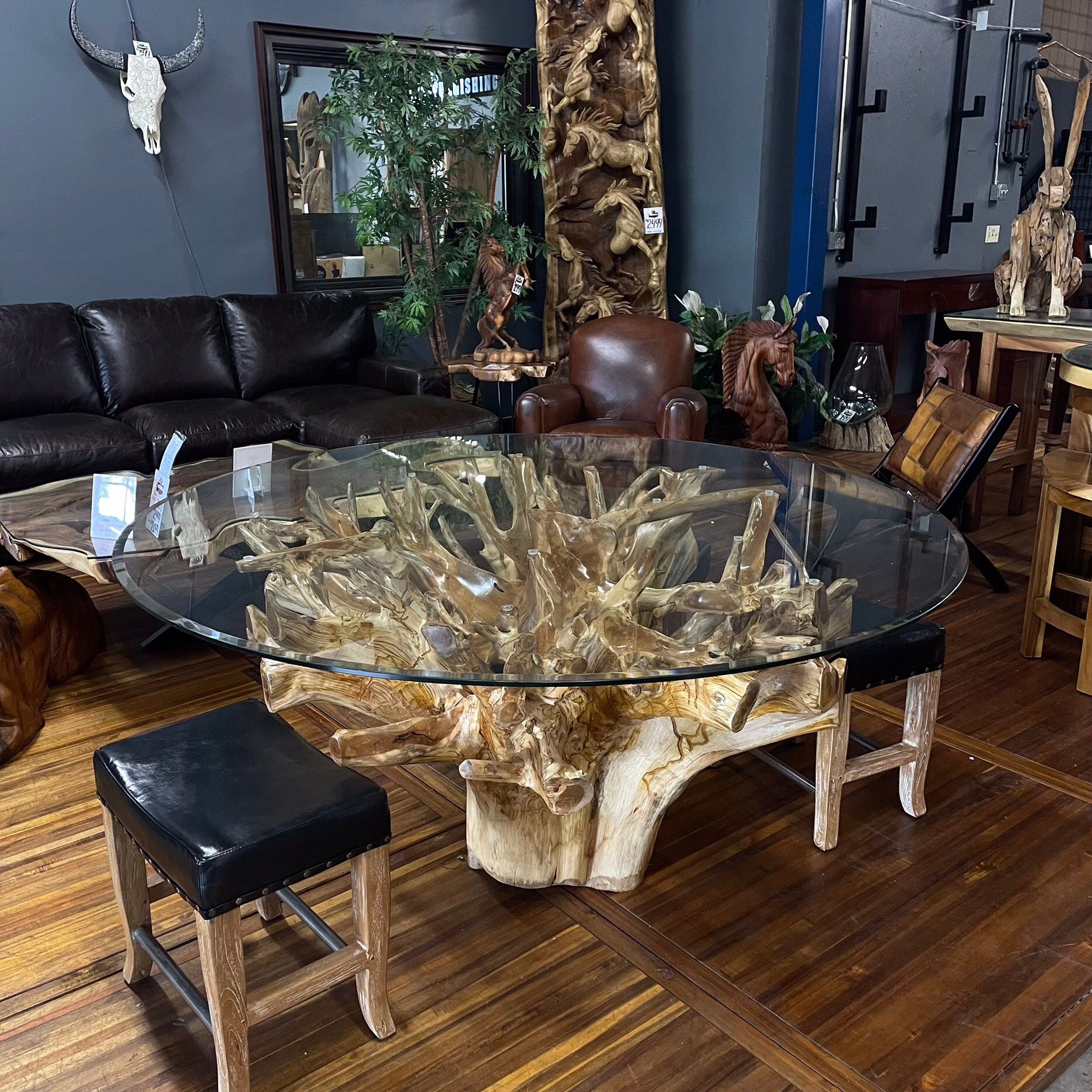 Teak Root Dining Table With Round Glass Top - 63” Diameter