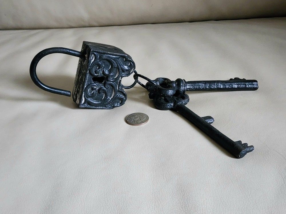 Medieval Cast Metal Iron Lock With Keys Lodge Home Decor Measures 11" Long.
