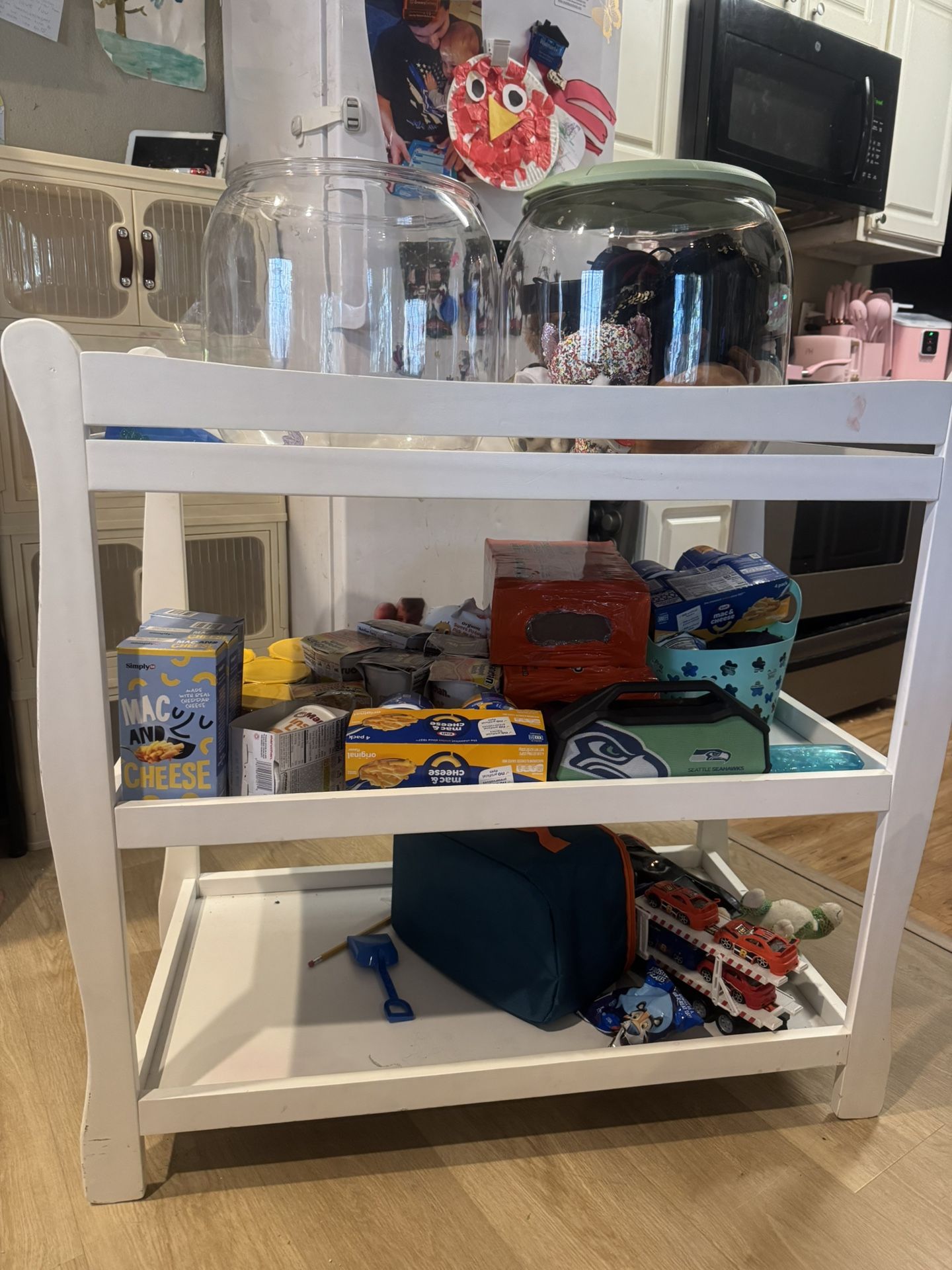 White changing table. Top isn’t pretty, but could easily paint white, or cover somehow. First come.