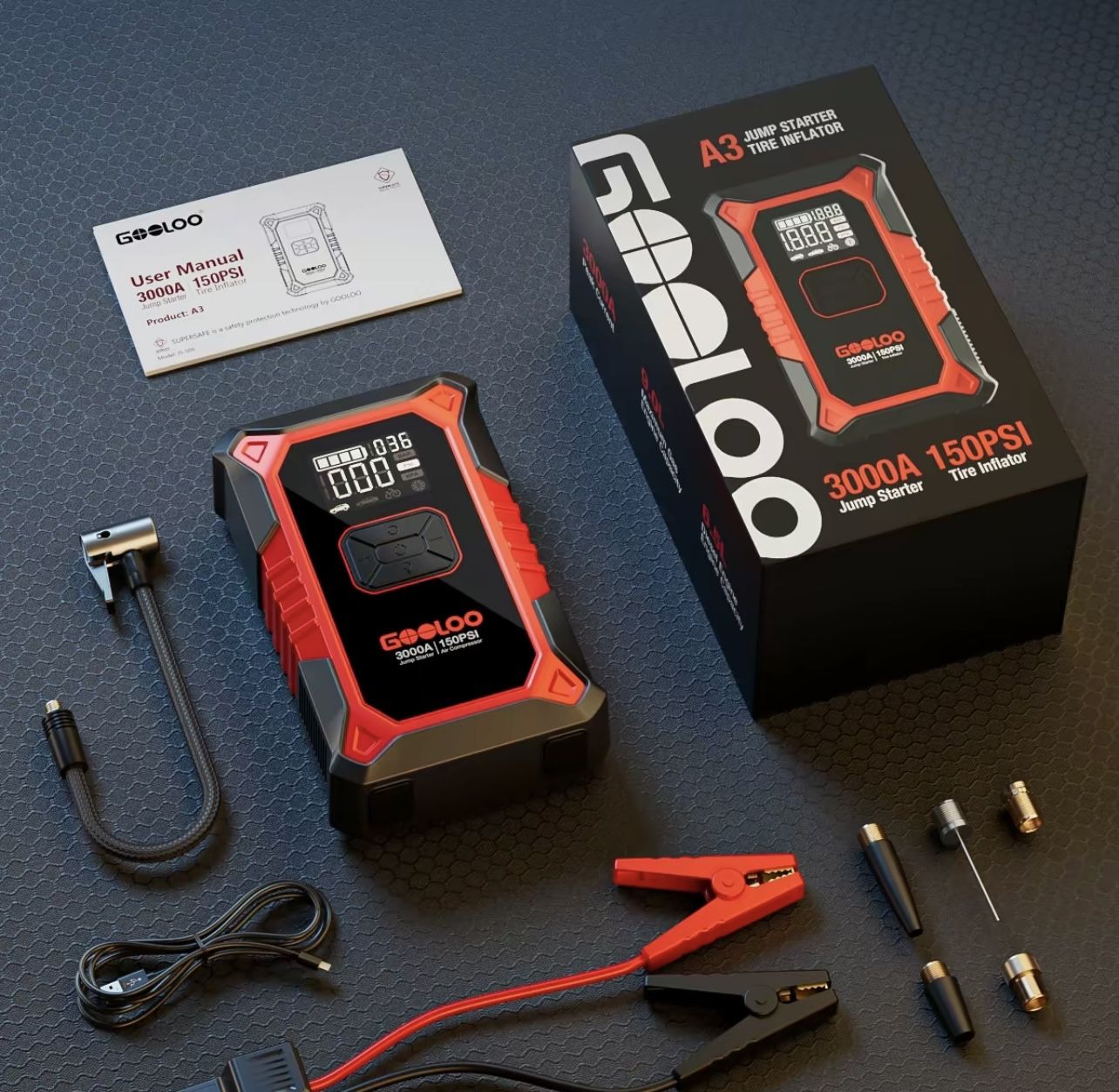 GOOLOO A3 Portable Car Jump Starter with Air Compressor, 3000A Car Battery Jump Starter (9.0 Gas/6.5L Diesel) with 150PSI Digital Tire Inflator