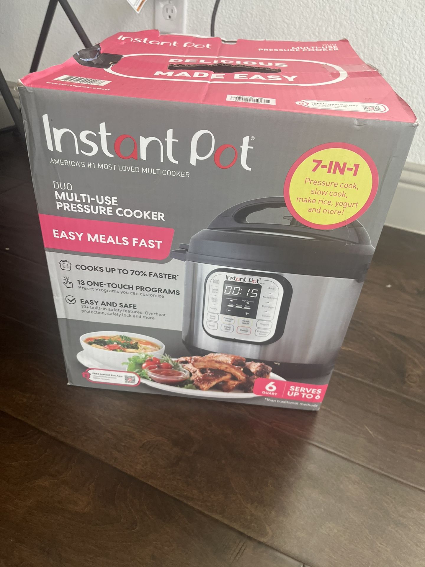 Instant Pot Duo 6-Quart 7-in-1 multi-use pressure cooker in great working condition. Clean, fully functional, and ready to use. Pressure Cooker Slow Cooker Rice Cooker Steamer Sauté Yogurt Maker Warmer Includes the original box. Perfect for quick meals, meal prep, and everyday cooking.