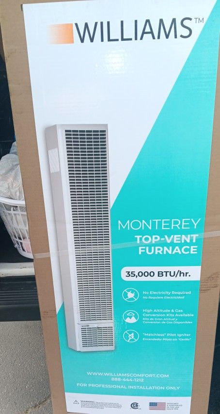 ***STILL IN BOX NEVER OPENED*** AT STORES FOR $1100 IN ASKING $600 or SHOOT ME AN OFFER !!! Williams Monterey Top-Vent Furnace, a heating unit designed for residential use. Heating Capacity: 35,000 BTU/hr. Power Source: Operates without electricity. Ignition: Features a "matchless" pilot igniter. Installation: Intended for professional installation only.