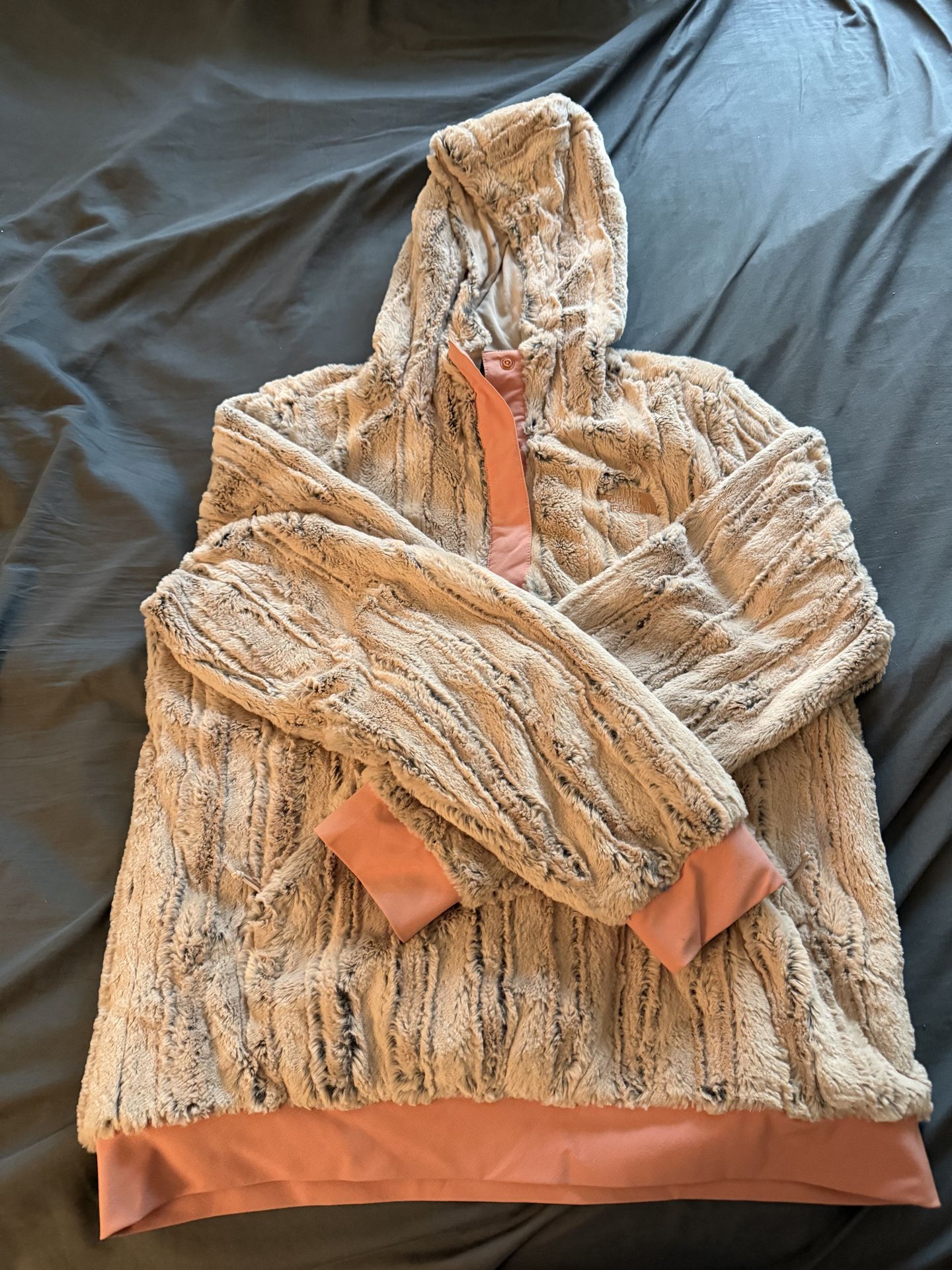 Furry north face quarter snap pullover sweater/hoodie. It’s a light tan/brown faux fur with pink accents. Women’s size M Please be able to pick up in Kenmore