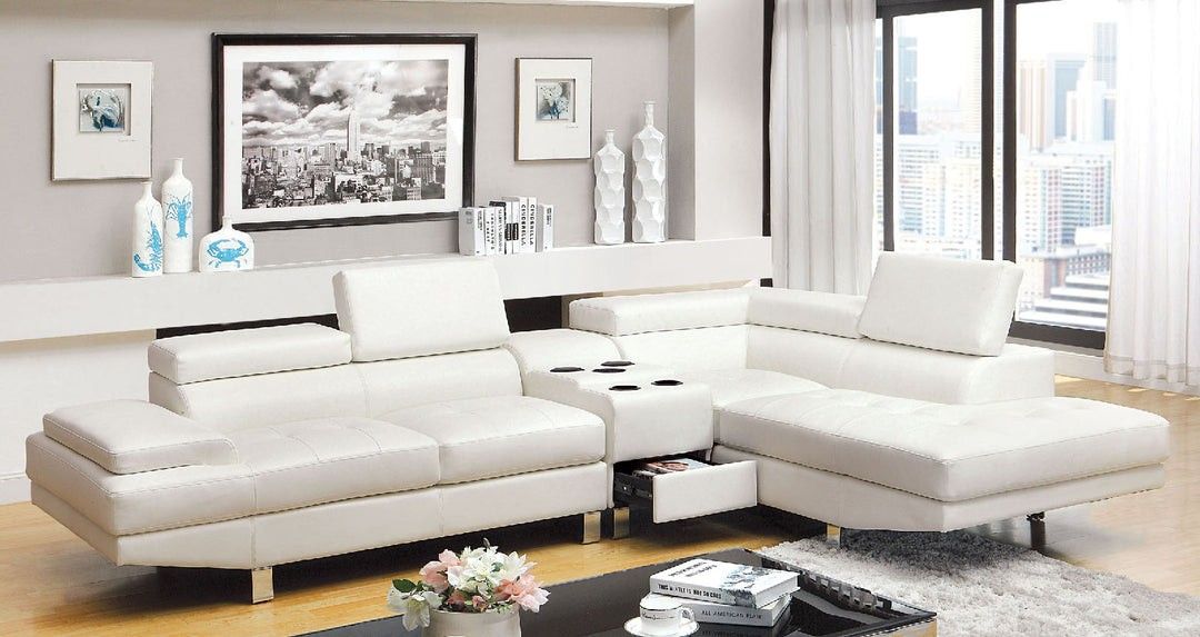 We are an online wholesaler and we deliver directly from the manufacturer to your home Brand new in the boxes Assembly is an extra charge We accept cash on delivery Mattress sold Separately Unique with its contemporary shape, this sectional has foldable headrests and armrests and an optional speaker console, which allows for wireless music playing. Available in either white or black bonded leather match. Contemporary White Bonded Leather Match Adjustable Headrest Speaker Console Chrome Legs Bonded Leather Match Built-in Cup Holders Pull-Out Drawer Bluetooth Console w/ Speakers Foldable Headrests Subwoofer in Console Back BLUETOOTH SPEAKER CONSOLE 16 1/2”X 38 1/2”W X 24”H SECTIONAL SECTIONAL W/ CONSOLE: 121 1/2”L X 82”W X 29”H,