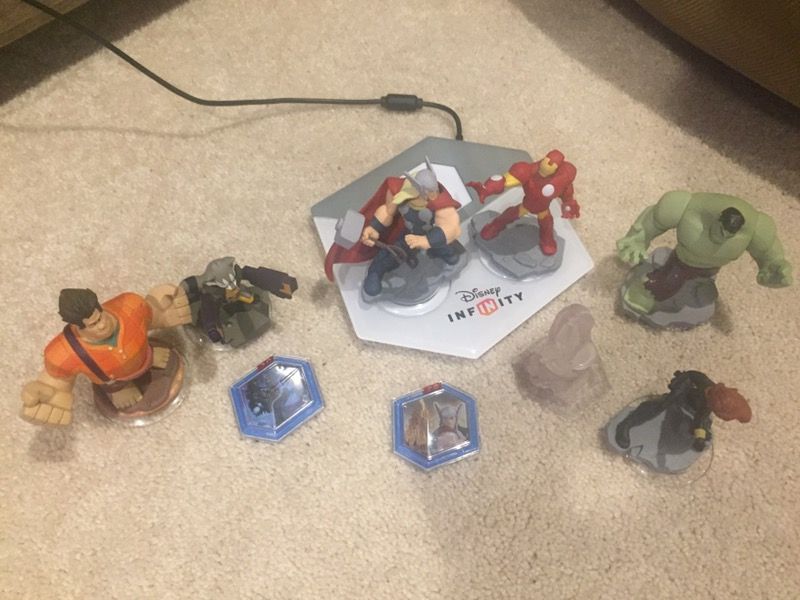 Barely used Disney Infinity 2.0 gaming system. 6 characters and 2 Marvel discs