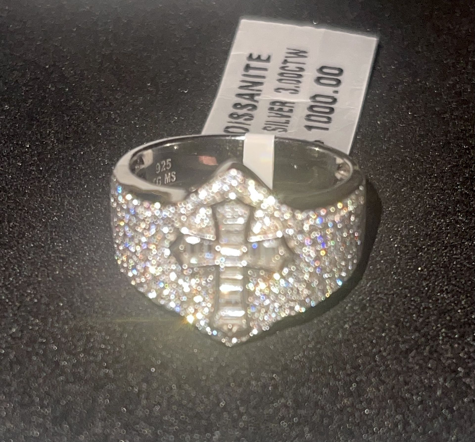 Moissanite 925 sterling silver Rhodium platinum finish 3ctw it’s caged on the inside It does pass diamond tester. Anillo para hombre. Moissanite 925 plata Acabado platino de rodio 3ctw enjaulado en el interior Pasa el probador de diamantes.