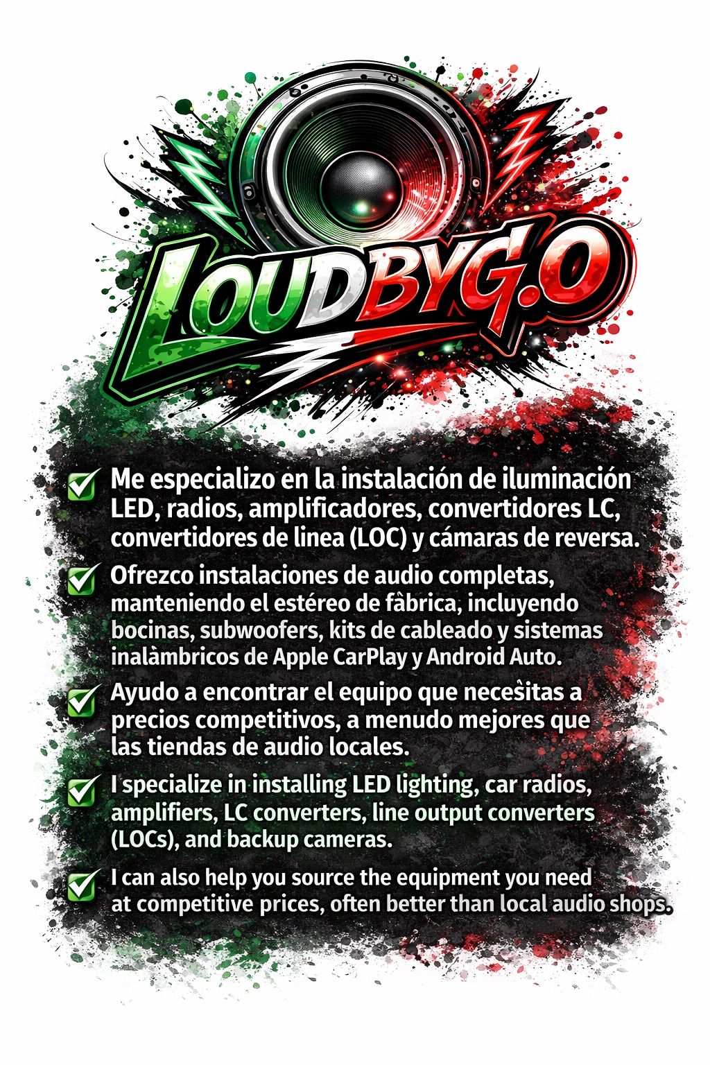 Me especializo en la instalación de luces LED, radios para autos, amplificadores, convertidores LC y convertidores de línea (LOC), así como cámaras de reversa. Ofrezco instalaciones completas de sistemas de audio manteniendo la unidad original, incluyendo bocinas, subwoofers, kits de cableado, arneses y sistemas inalámbricos de Apple CarPlay y Android Auto. También puedo ayudarte a conseguir el equipo que necesitas a precios competitivos, muchas veces mejores que los de las tiendas locales de audio.