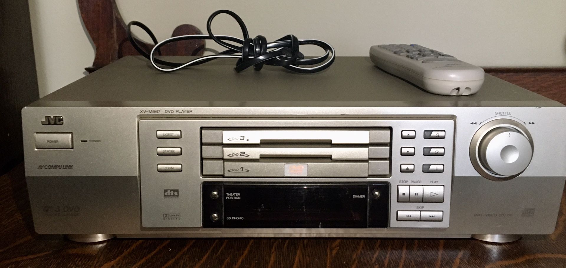 The XV-M567GD is the perfect choice for the person who wants to combine a high performance DVD player and CD-Changer. This 3-DVD/ CD Play & Exchange player includes many functions such as, Strobe, Digest, Angle, Zoom, Theater position, 3D Phonic, Parental lock, Multi-language sound and subtitles for your personalized viewing experience. The XV-M567GD also includes Component video and S-Video outputs for a superior picture quality of up to 500 lines of horizontal resolution. •ALL OFFERS CONSIDERED•
