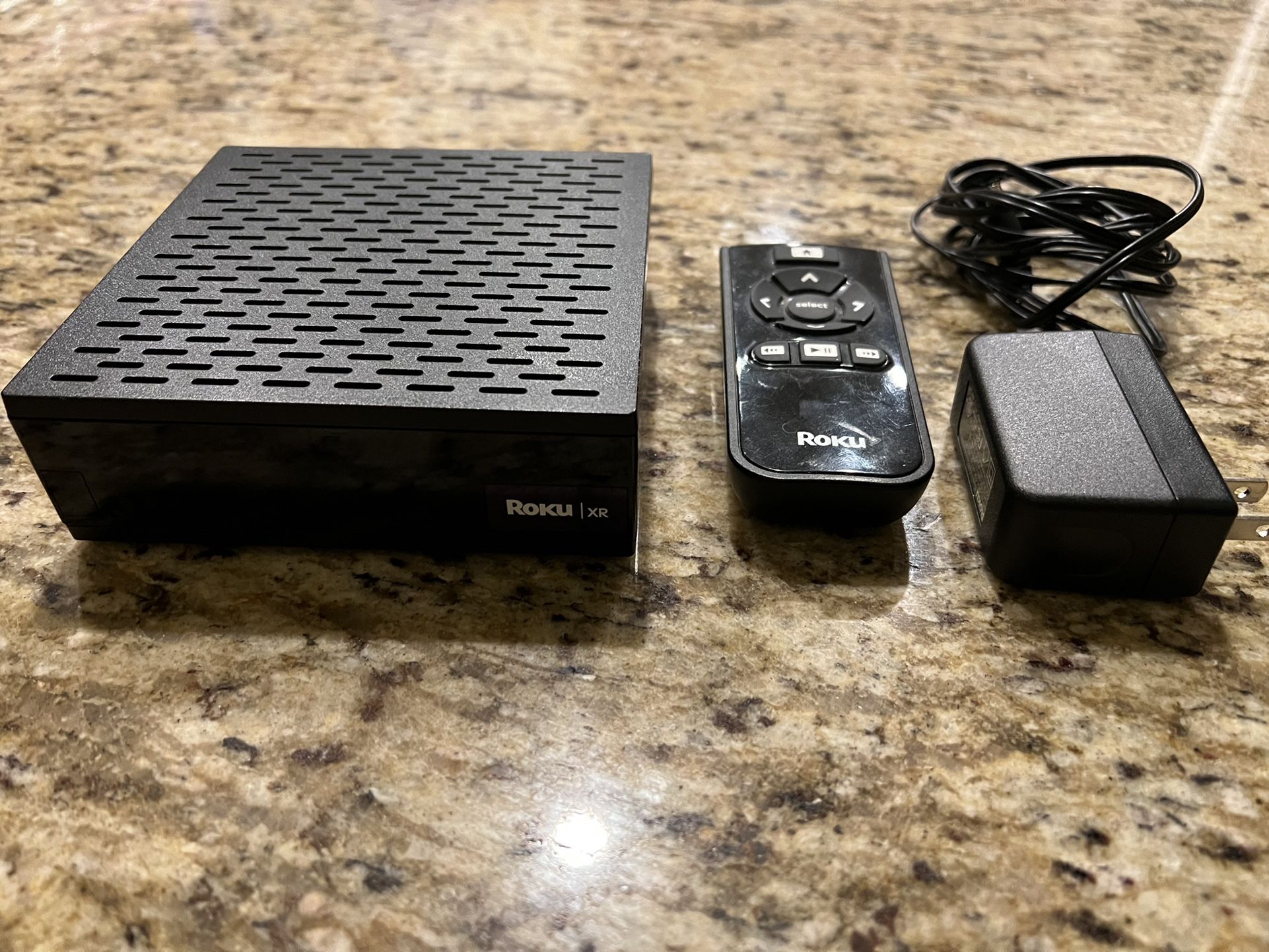 Roku XR media player. Can load Amazon app and others to play streaming. Can put movies or music on a thumb drive and plug in to play with selectable menus on screen. Has HDMI and RCA outputs. Cat 5 for internet as well. Comes with remote and power supply as well.