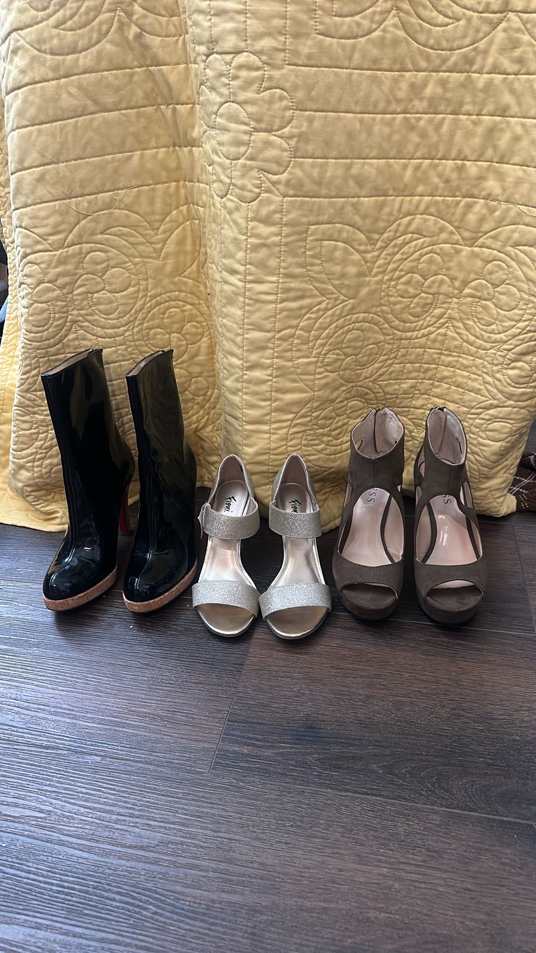 Black boots 6.5- $10 Gold heels 5.5 - $10 Brown Wedge 6 - Guess brand $15 All unused new