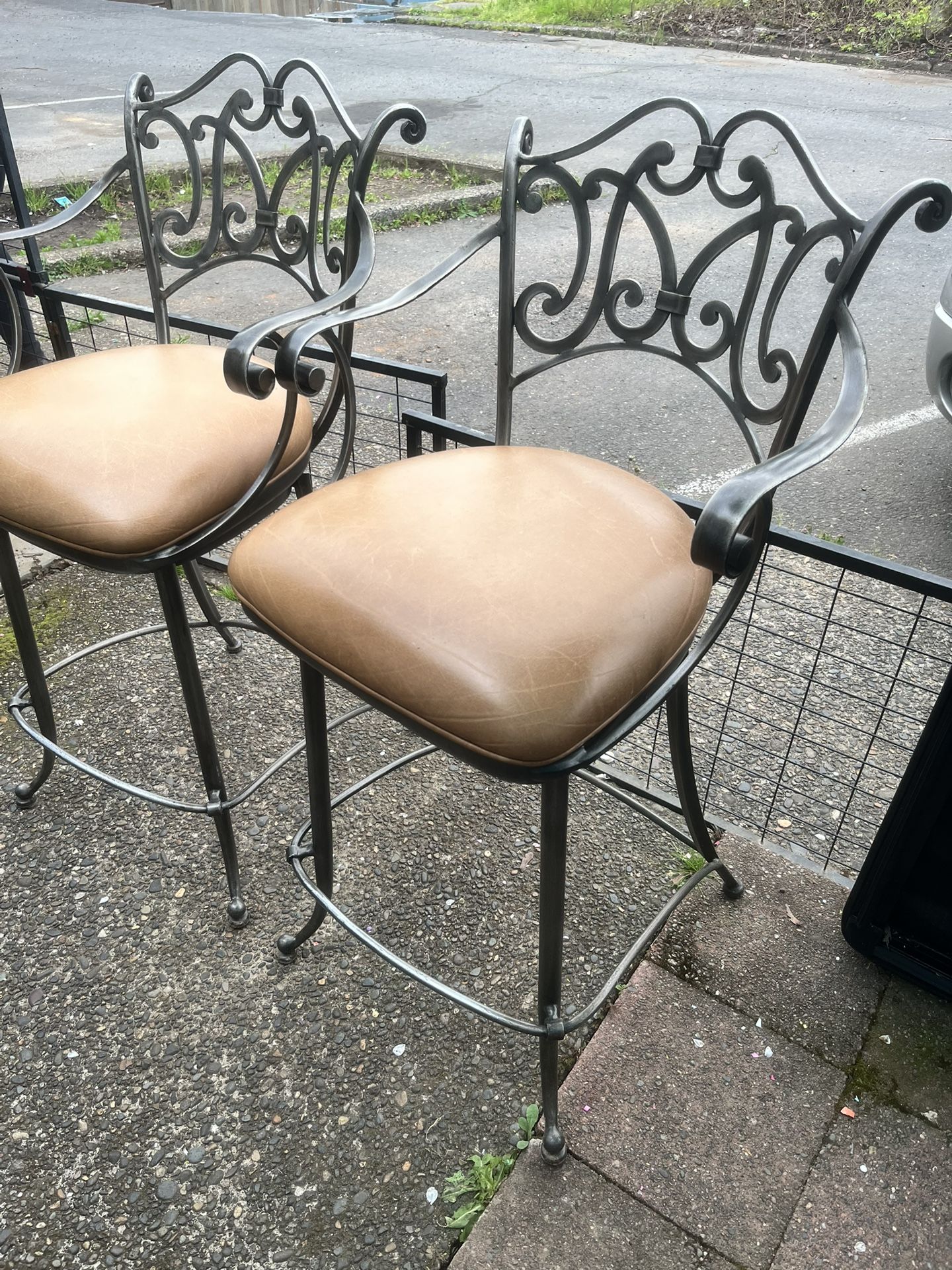 Barstool chairs, swivel and are made of iron. Very comfortable and sturdy.