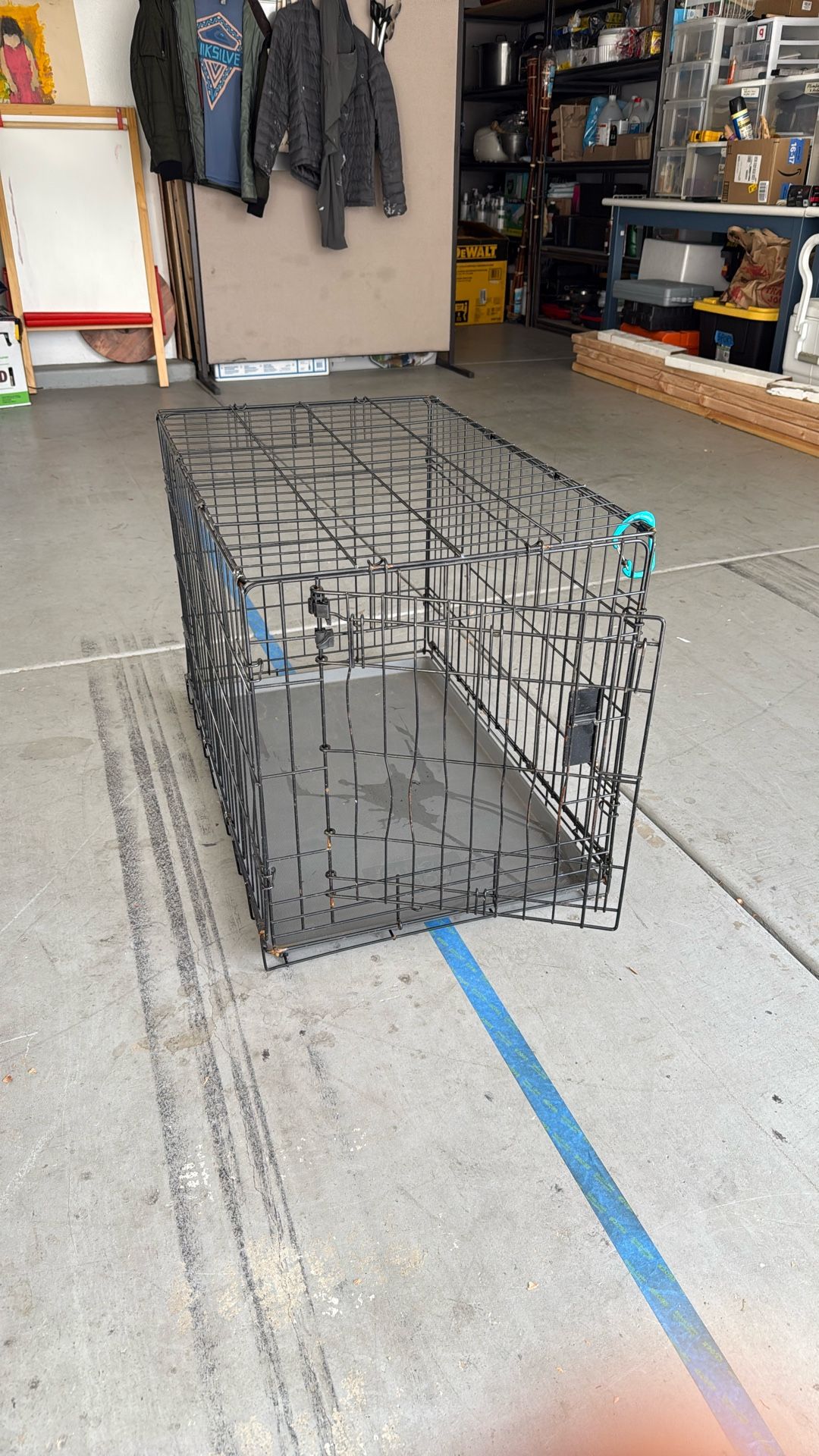 Free dog crate for medium sized dog. Door latch is sort of wonky but it still works.