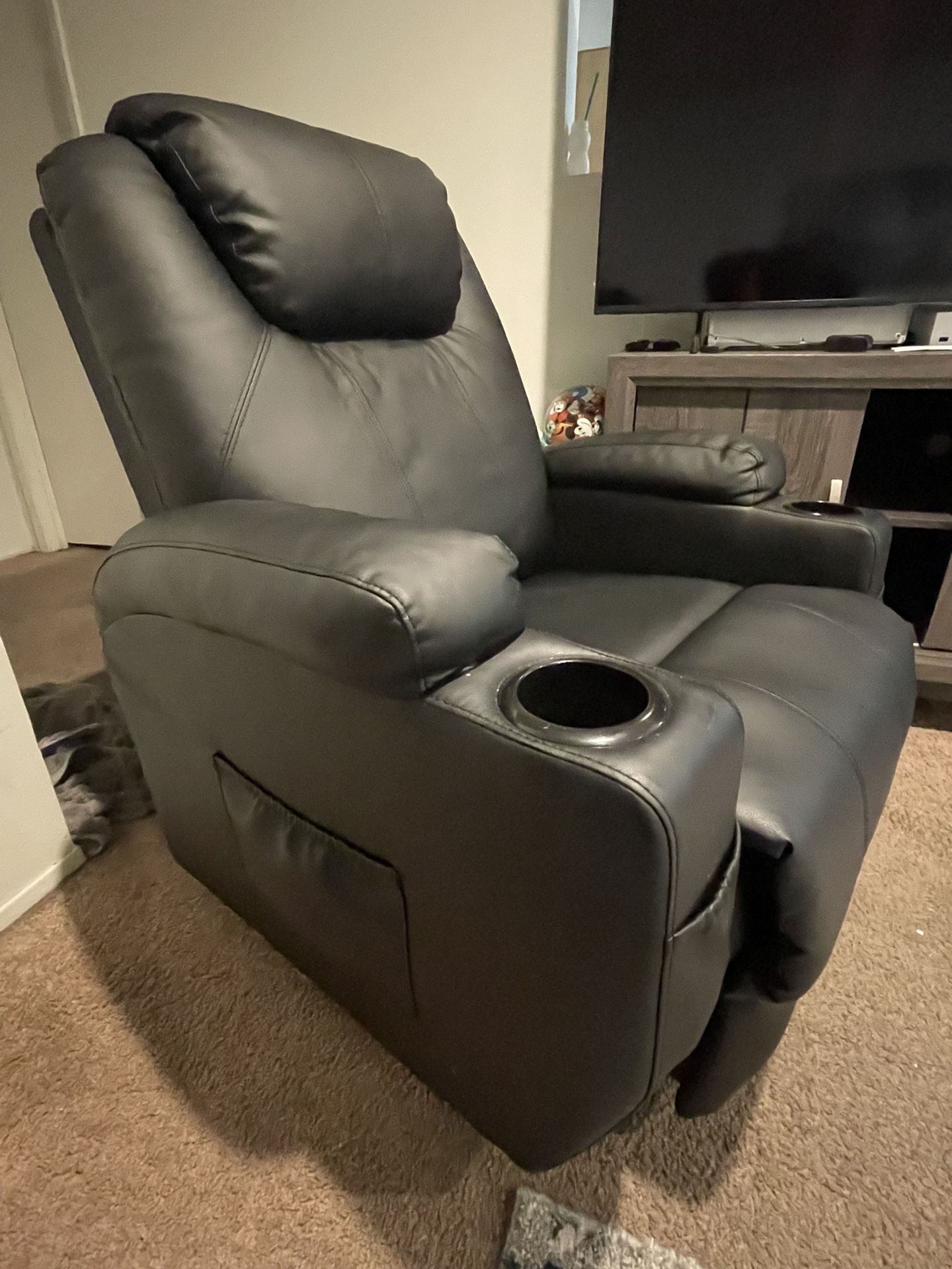 Silla reclinable color negro con masaje y heater Es mesedora Detalles estéticos en las fotos