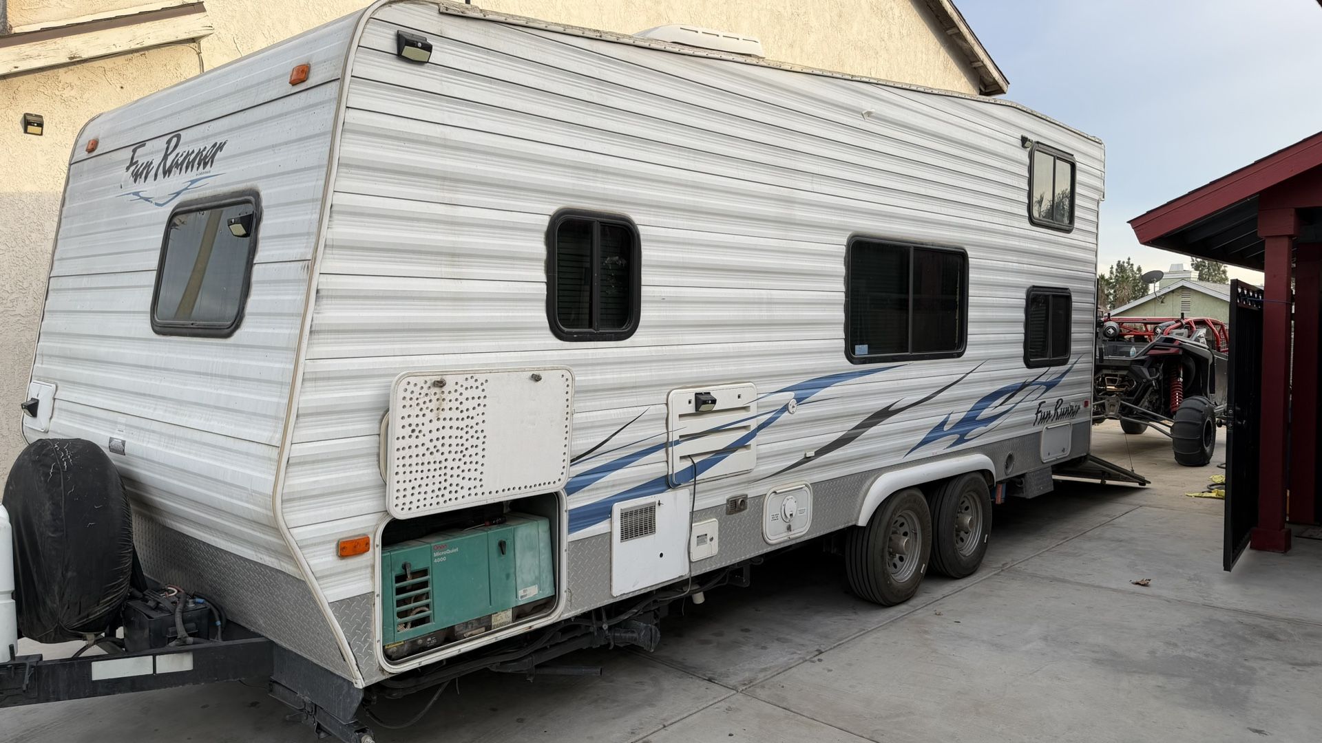 Selling my 2007 carson fun runner toyhauler trailer Very well maintained everything works as it should New tires new floor new awning new stereo new tv new batteries new floor jacks Has onan 4000 gen 20 gallon fuel station has a hitch receiver flag mount Fits my 4 seater rzr pro r with paddles and my kid trx250 alot of storage 2 queen beds 2 single beds Ac blows cold heater works well water pump and water heater work very well just maintenance generator and roof was just resealed 15 feet to first cabinet 81 inches in between fenders