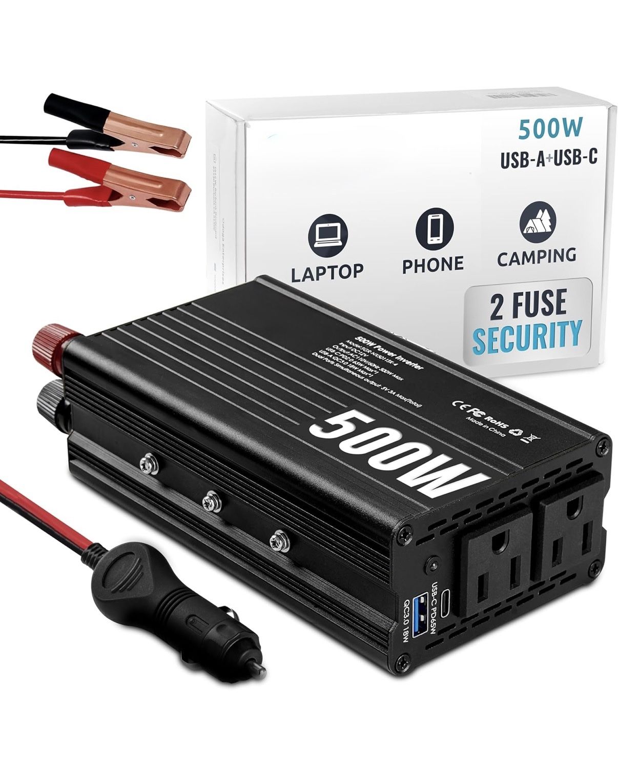 500W Car Power Inverter 12v to 110v – Car Adapter for Plug Outlet, DC to AC Converter, USB/USB-C Fast Charger for Laptop, Phone, Dual AC – for Vehicle