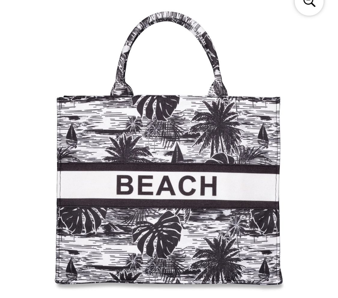 London Fog Beach Canvas Tote. Large tote 16x14x6. Black and white canvas palm tote. Has magnetic snap closure.