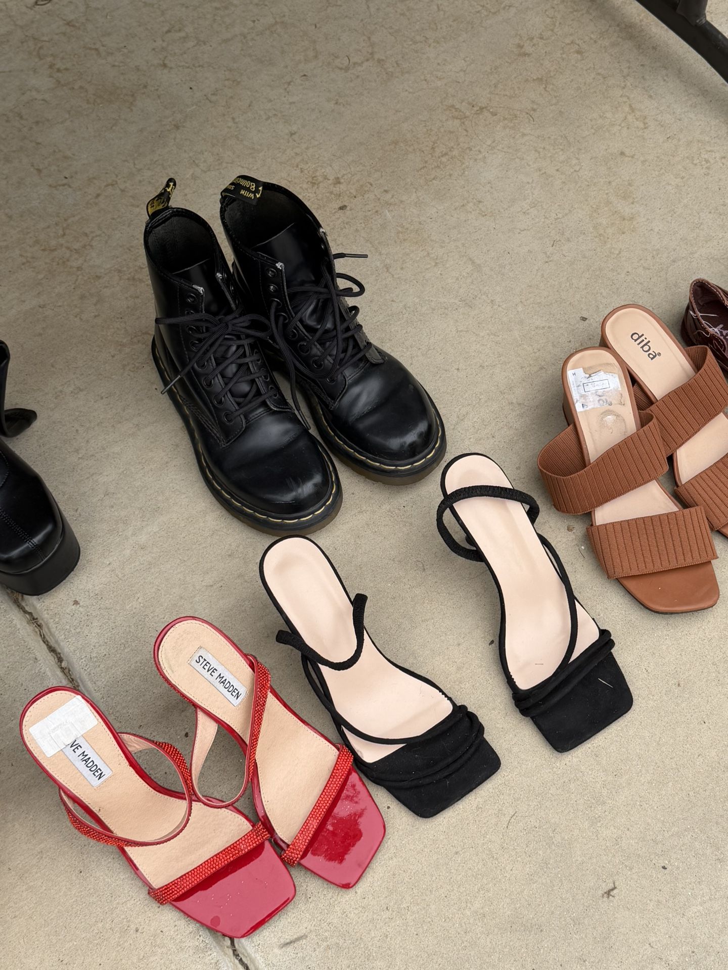 All shoes for sale!! Cover photo: •Dr martens- size 6 ($30) •Steve Madden heels - size 7 ($7) •Black strappy heels - size 7 ($7) •Brown heels - size 7 ($7) NEW ————— White Air Force’s size 7 ($15) Black boots with heel size 7 ($15) Red shiny heels in box size 7 ($7) NEW ALL sandals $3
