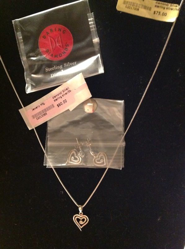Brand new heart necklace w/genuine diamond, 925 sterling silver (stamped). Total item weight 5.3. Length 18". Retail $75.00. Brand new heart earrings w/genuine diamonds made of 925 sterling silver (stamped). Length 19mm. Retail $60.00. Sold as set $50.00.