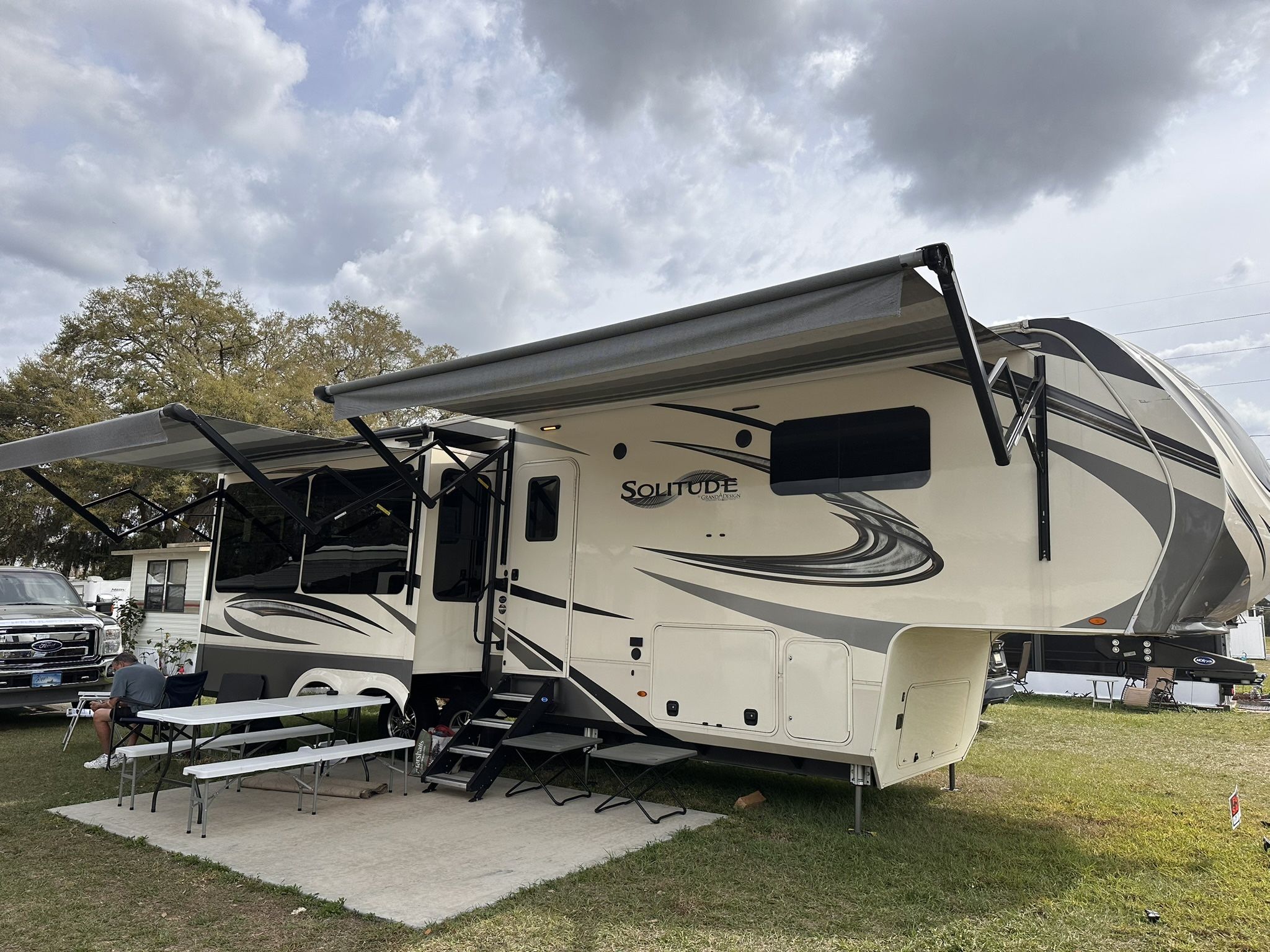 If you’re looking for a luxury 5th Wheel that’s been upgraded and well cared for, this 2020 Grand Design Solitude 310 GK is fully turn key and ready for travel or full-time living. Brand New Flex Roof with Lifetime Warranty. Warranty is Fully Transferable to New Owner Brand New Rear A/C Unit Brand New Kitchen Vent Fan Absolutely NO LEAKS - Ever Weather-Tec Package Heated, enclosed underbelly for cold-weather camping Central Vacuum System King Size Master Bedroom 3 Slide-Outs for massive open living area Spacious rear-living floor plan with large windows Residential style kitchen with tons of storage Private master suite and large bathroom Quality grand design construction throughout