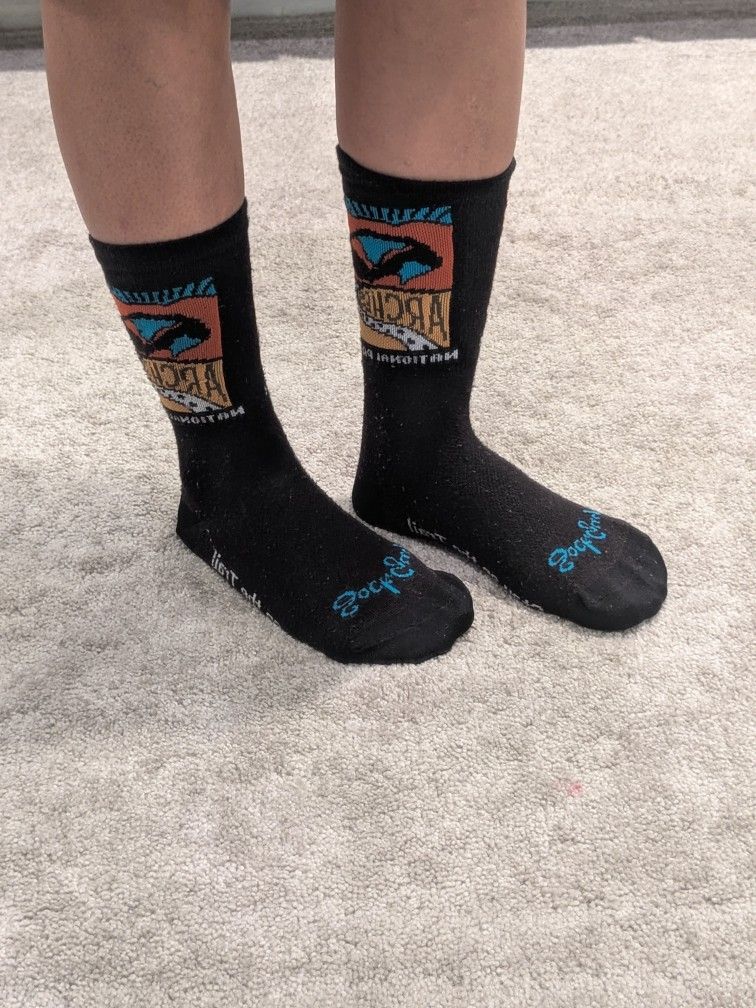 Arches National Park Performance Crew Socks Women 6-10 Men 5-9 (M) Delicate Arch. Official Authentic National Park Souvenir! NOTE: THERE ARE PAINT SPOTS ON THE BOTTOM OF THE SOCKS (ON BOTH SOCKS), PLEASE REVIEW THE PHOTOS PRIOR TO BUYING THE ITEM. Comfortable, moisture-wicking crew socks adorned with Delicate Arch and a reminder that Your Steps Matter / Stay on the Trail stitched on the foot. Stretches for the perfect fit. Size: M Women 6-10; Men 5-9. Material: 75% Micro Denier Acrylic, 15% Nylon and 10 % Spandex.