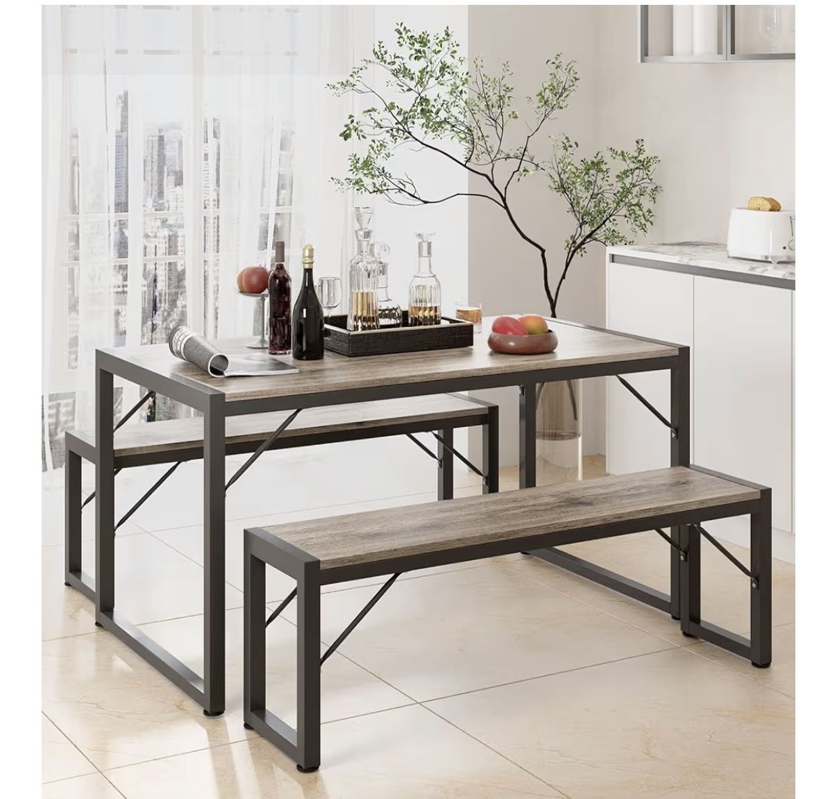 Like New. Pictures of table purchased online. Out of the box and not put together. All pieces included. Very easy to assemble. Dining Table Set for 4 with 2 Benches, Kitchen Table Set with Metal Frame & MDF Board, Space-Saving Dinette for Kitchen, Dining Room -Grey