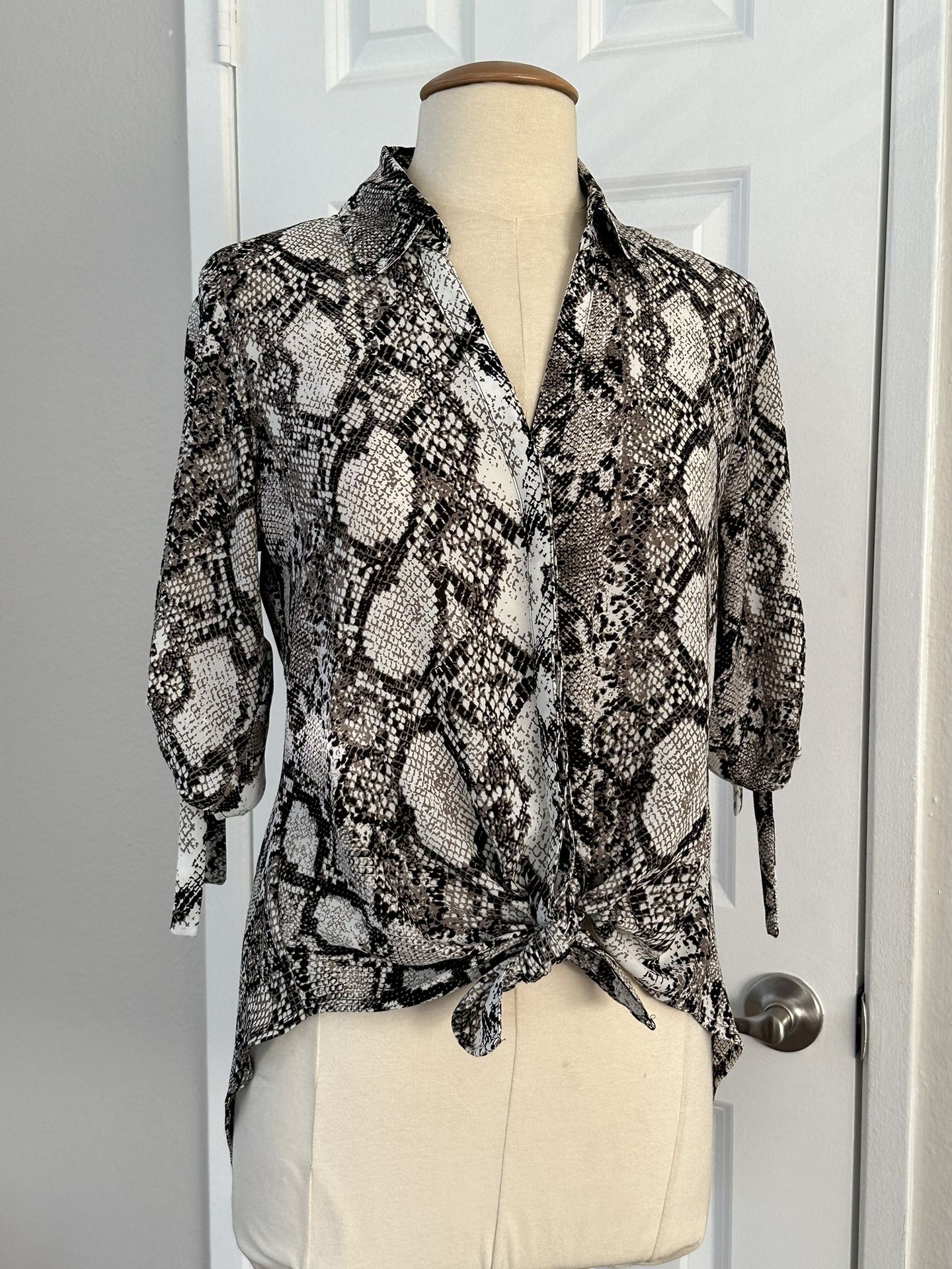 Express button down blouse with ruched half sleeves. Only worn once. Great style. Can be tied on the front, belted or tucked in. Looks great with skirts and leggings, or dress pants. Chiffon fabric with snakeskin print. Sleeves are adjustable length with tie detail. Covered bottoms down the front. Pick up in South Phoenix, Central and Baseline