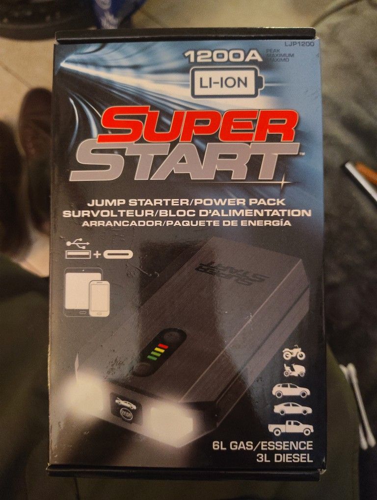 Super Start 1200A lithium ion emergency battery jumper with 18w USB output for phone charging and led light