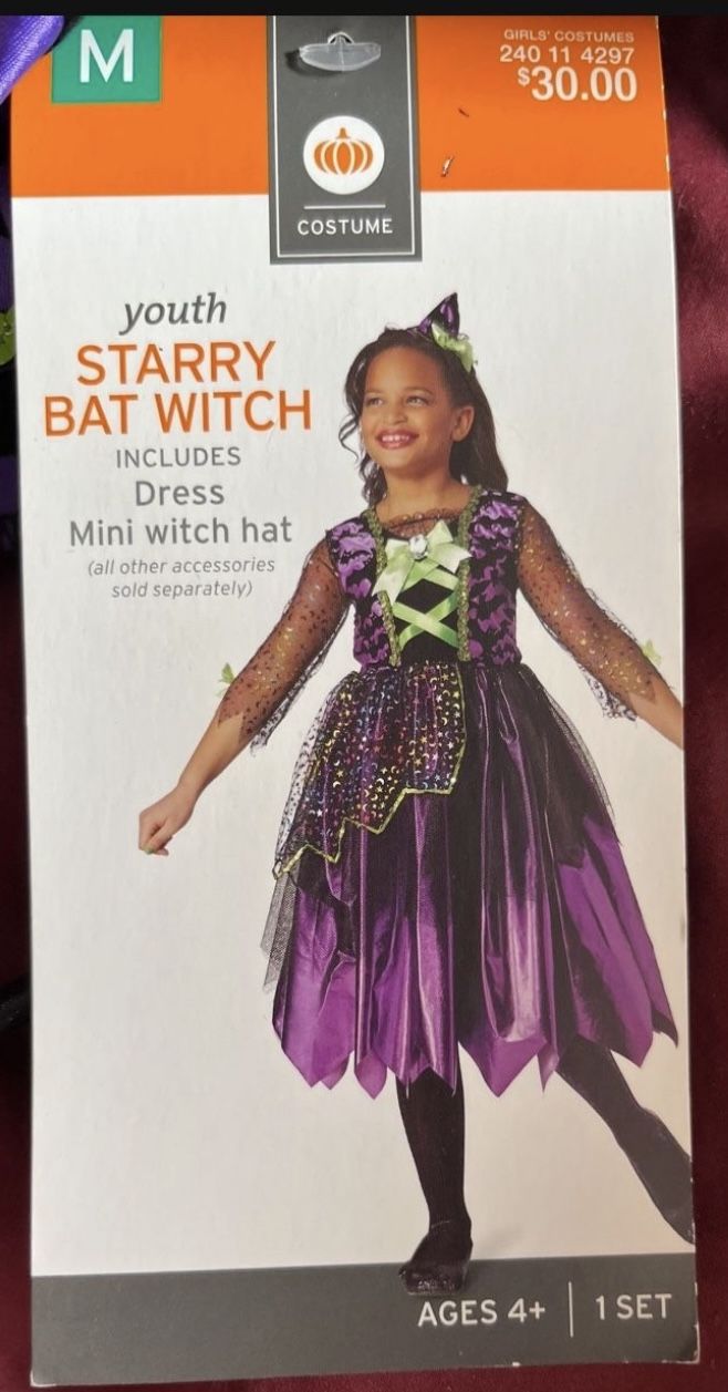 New Never Used Youth Girl's Medium “Starry Bat Witch” Halloween Costume + Mini Hat. Youth Size Medium (7 To 8) *Please note in the pictures the tear in the green straps in the rear of the costume Height 45.5-53.5 Inches; Chest 27-27.5 Inches; Waist 23.5-24 Inches Never Used, Tags Attached Pick up location by tropical Park Westchester