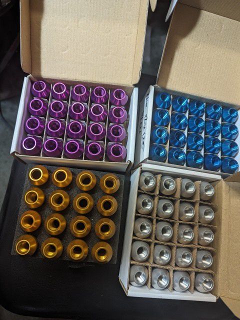 Aluminum lug nuts M12 X 1.5 also have M12 by 1.25 lug nuts. These are manufactured by Blox racing (Tuner ). I have several different colors available. Excellent price$18 or $10 per box when you buy 5
