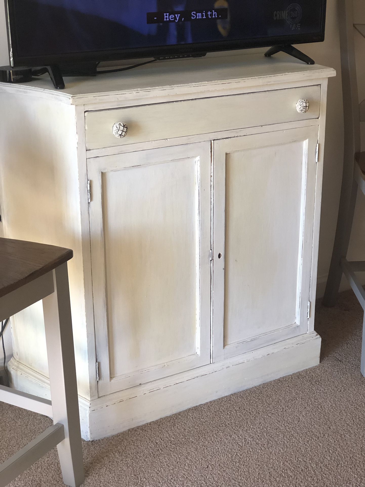 ‼️ MAKE AN OFFER ‼️ Vintage White Sideboard Buffet Cabinet for Kitchen Dining Room, Modern Storage Cabinet, I use it as a TV stand. I also have the original brass draw pulls. Double doors, one adjustable shelf, one draw, all original hardware. Slightly curved sides approx. 34” across back 13”deep, 30” wide, 35” high Must pick up Smoke free home
