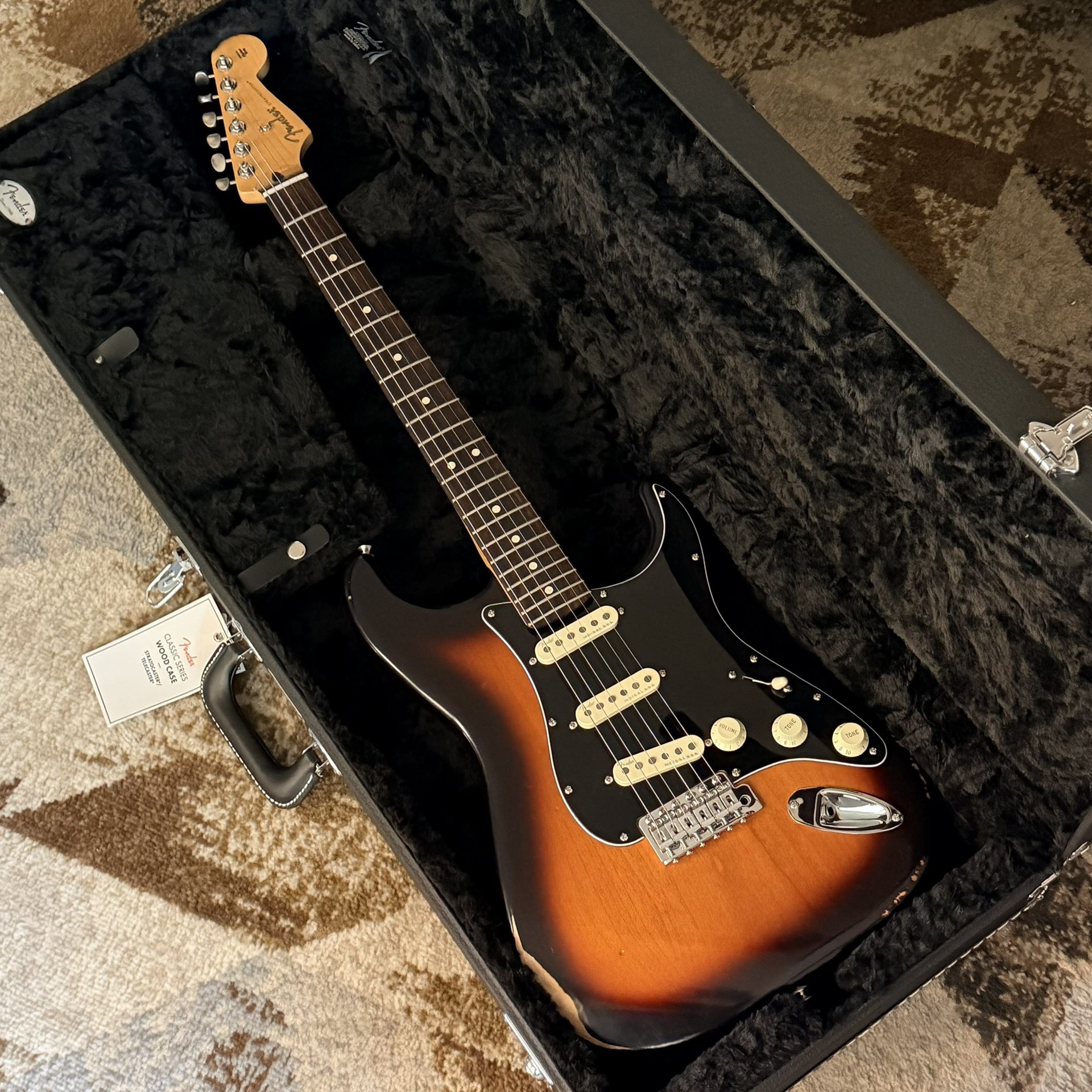 Price firm. No trades. Thanks. Technically a high end Fender partscaster, but all genuine Fender parts. In fantastic condition! Body: genuine Fender Road worn nitrocellulose three color sunburst body Neck: genuine Fender Player II neck (rosewood) Pickups: Fender Ultra Noiseless Vintage Weight: 7lbs 10oz Includes Perry cotton strap, trem bar, road worn Fender Classic Wood Case