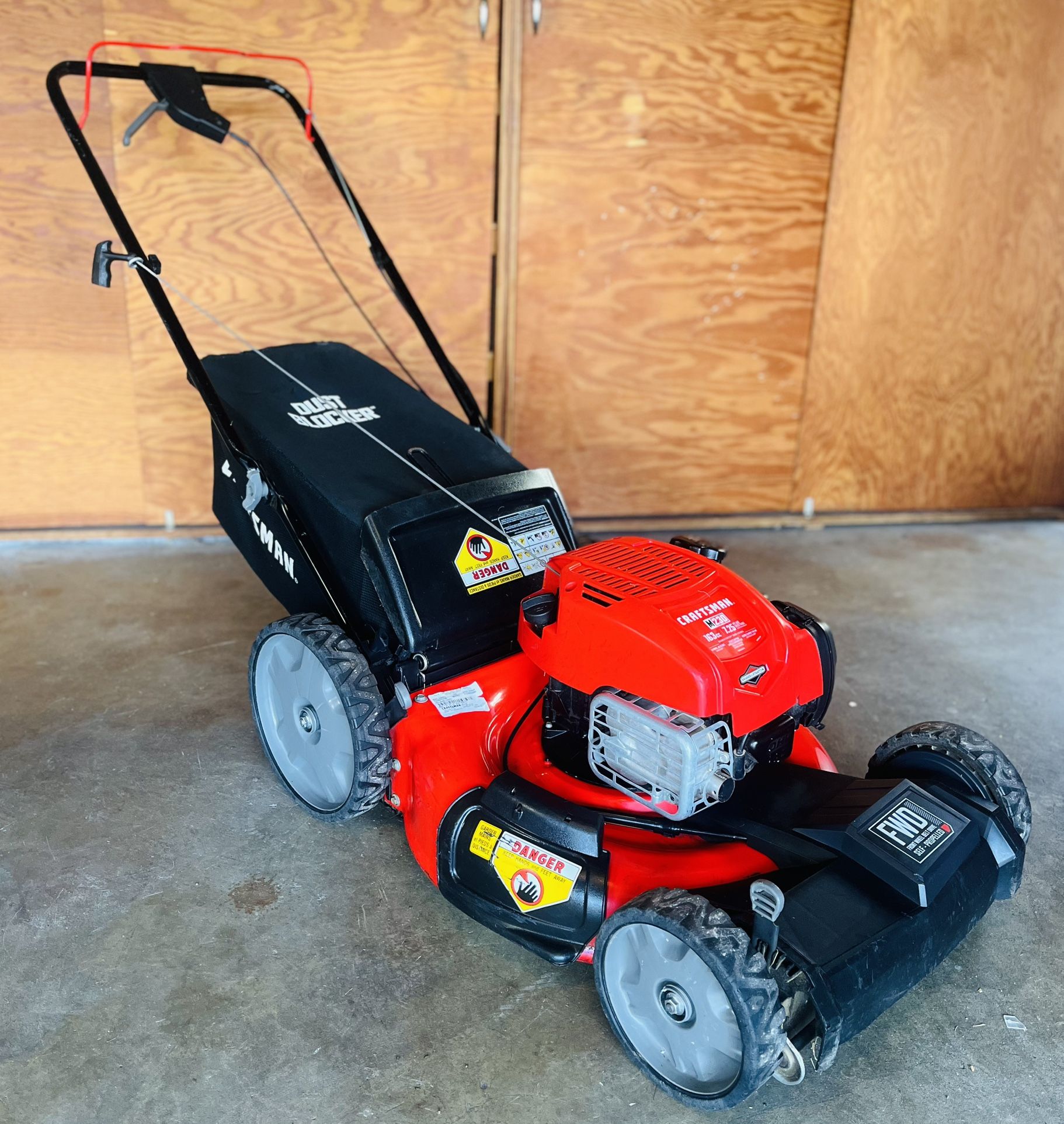At only three years young, this Craftsman M230 lawn mower is in excellent condition. NO issues, NO leaks, starts every time on the first lazy pull (no exceptions), and not even any "curb rash" on the sides. This lawnmower is super-clean above and below the cutting deck, and runs as good as it looks. Suitable for residential or commercial use. The engine oil and air filter are NEW, and the blade was just sharpened. This lawnmower is ready for work! If you could get this mower in California (which you can't anymore), it would cost you nearly $420 (when you include tax) at Lowe's. The price is FIRM. CASH ONLY, please. SPECIFICATIONS/FEATURES: * Powerful/Dependable engine: 163cc OHV Briggs & Stratton engine with automatic choke (which eliminates choking or priming before starting) * Self-propelled variable speed: Front wheel drive allows you to mow at your own pace * Compact storage: Features a folding handle for compact storage * High rear wheels: 11-in rear wheels allow you to navigate over rough terrain * DUST BLOCKER Grass Bag: Reduces messy dust clouds * Height adjustment: Dual-lever, 6-position height adjustment makes it easy to change cutting heights from 1.25" to 3.75" high * Deck wash port: Connect to a garden hose and rinse away clippings and buildup * Comes complete with the side-discharge chute, so you have the 3-in-1 option of bagging, mulching, or side discharging * U.S.A. made