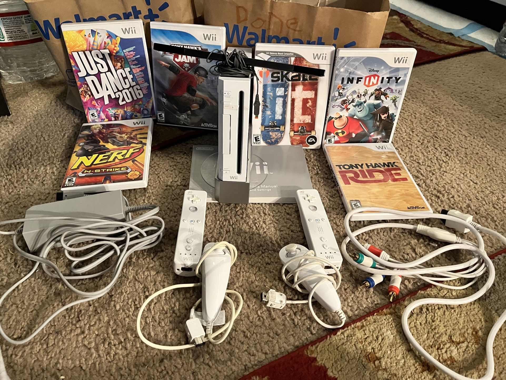 Used condition with light scratches on games and Wii system but all works great just missing the cover and has a sticker on it. This is a white Wii with 4 controllers, the Wii remote reader, all cords, 6 games.