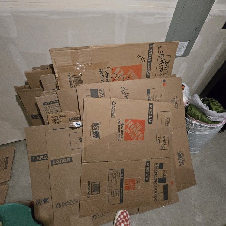Around 50-60 home depot moving boxes. Most of them are XL, L, few M and few small .