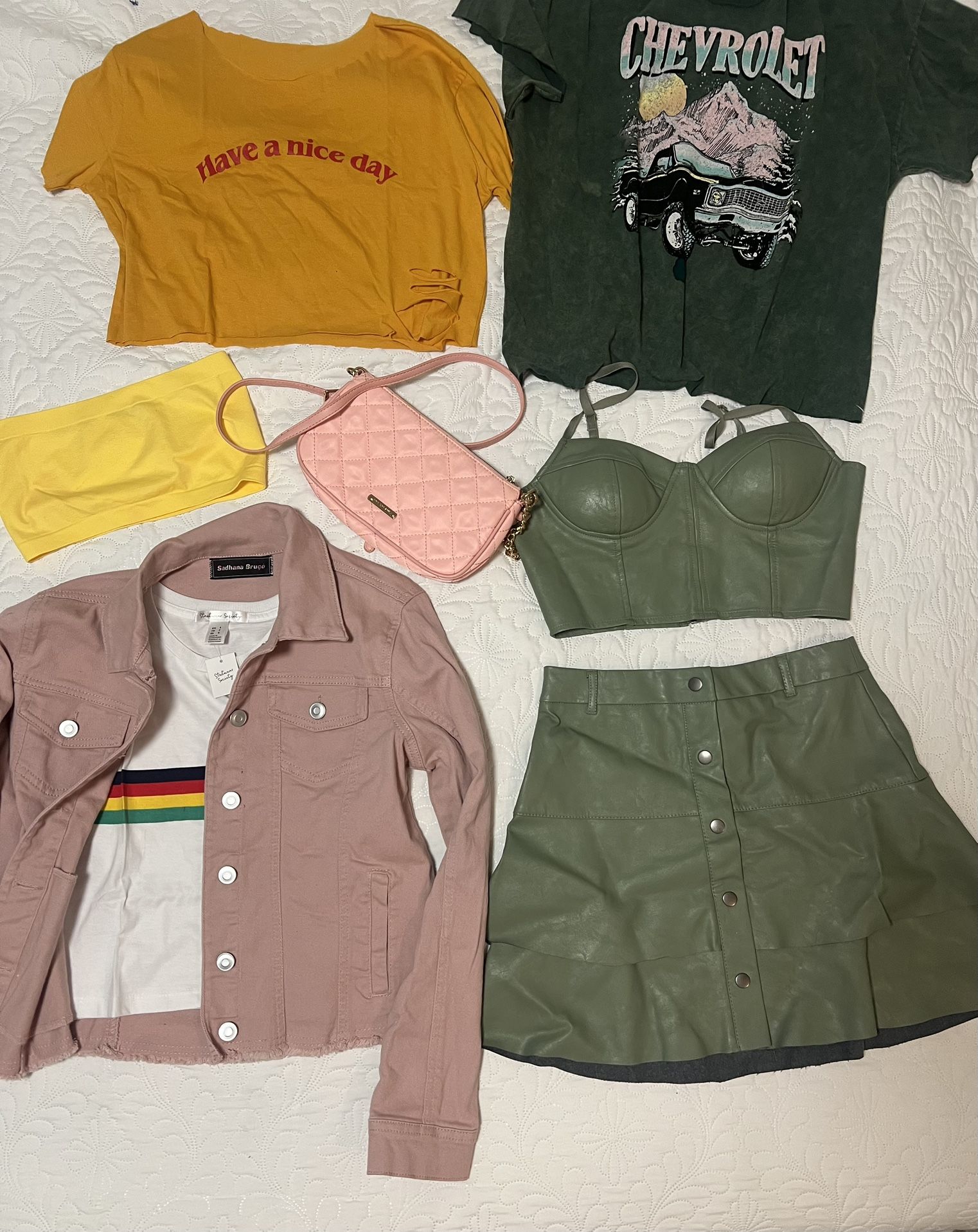 Selection of varied clothes, most of them new. The pink bag I used it a lot 🥰 but it's still beautiful. The jacket and blouses are new. I only used the green set a few times.