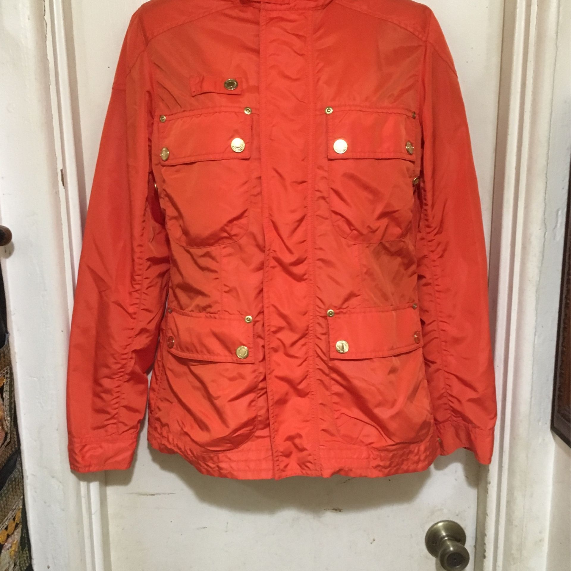 Women’s hoodie jacket by Ralph Lerann bright orange all the hardware is brass finished has a hoodie it has a zipper so you can hide it in the front there’s a zipper and snaps 4 front pockets with snaps looks like new 100% nylon no spots no rips very classy