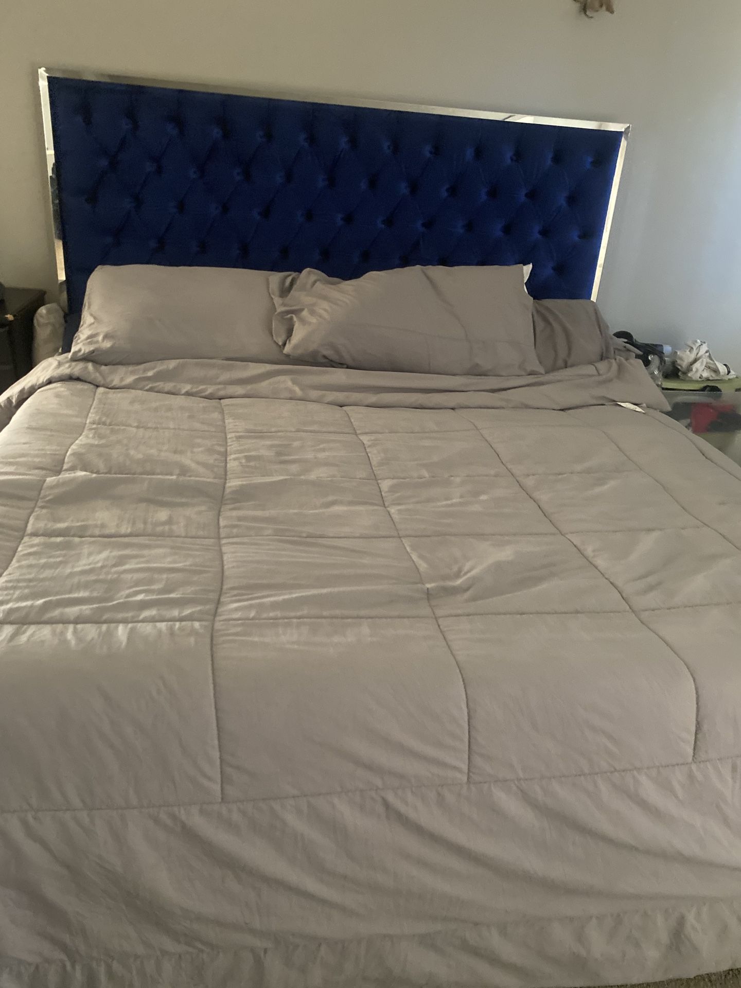 Selling this beautiful royal blue king frame bought from Amazon about 5 months ago decided to do the room a different style will not match with bed paid 700$ for it asking 500 obo my lose your gain no box spring needed comes with wood boards txt me at (contact info removed)
