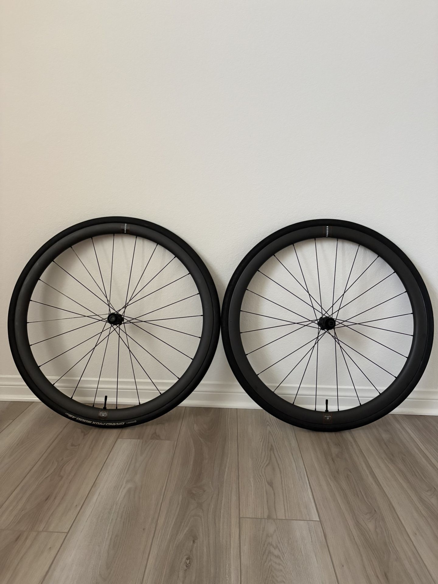 Premium Climbing & All-Rounder MSRP $2,500 + Tax Selling a high-end Reserve 34/37 Turbulent Aero wheelset built with top-tier DT Swiss 180 hubs. Perfect for climbing, fast group rides, and all-around road performance. Weight: 1200g. Rim tape, valves and Continental GP5000 STR with fresh sealant are installed. Key Specs: * Model: Reserve 34/37 TA (Turbulent Aero) * Hub: DT Swiss 180 (lightweight, ceramic bearings, ultra-smooth) * Rim Depth: 34mm front / 37mm rear * Inner Width: 22.8mm front / 22mm rear * Tubeless Ready, can be used with Clincher tires as well * Brake Type: Disc * Axles: Thru-axle * Freehub: SRAM XDR installed + Shimano Condition: * Excellent condition, * Low mileage * Lightweight and fast on climbs * Stable in crosswinds * Great tire support & comfort * Premium DT180 hubs, top performance & reliability