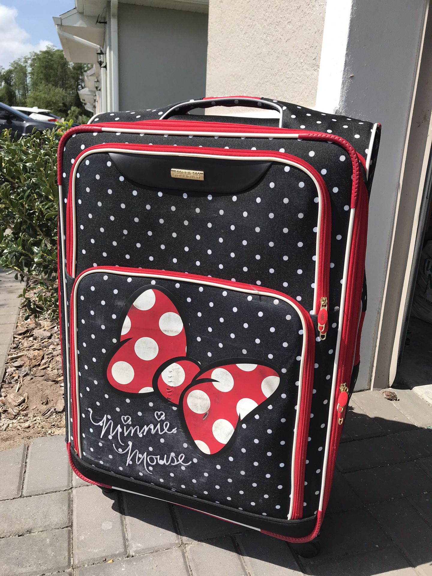 There is a scratch across the bow and one of the front zipper handles is missing, but still a solid suitcase. Weights about 3lbs. Measures 30x20x12 from a clean, smoke free home.