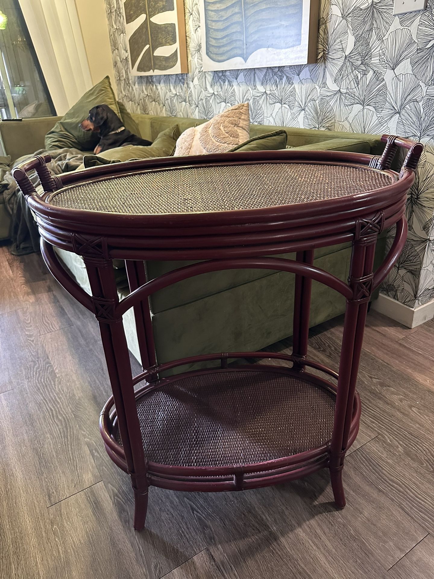 Gorgeous Vintage bamboo Bar table with removable top. This piece is stunning and adds style to any room. Some wear to the rattan on top. Unfortunately I no longer have space for it. 32ʺW × 20.5ʺD × 34ʺH
