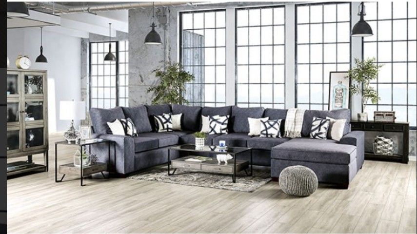 βπ« We do not have a showroom. We deliver directly from the manufacturer to your home π . π Delivery is only $40 π οΈ Assembly is an extra charge. Price on assembly depends on which item you order! π΅ We accept cash on delivery Mattresses are sold separately π₯We are voted #1 on offer up, please also view other options on our page!!! SM7771 Add some modern charm to your home with this living room sectional. Cushions with welt trim provide visual interest while the wide, slightly angled arms offer a comfortable resting area for your arms or head. There's plenty of room to straighten up your leg on the right chaise offering the very best setting for long movies or casual gatherings. Oversized and bold, the whole set is upholstered in navy denim-like fabric. Contemporary Navy Fabric, Solid Wood, Others Box Seat Cushions Loose Pillow Back Chaise on Right Welt Trim Tapered Wooden Block Leg Pillows Included US-Made (Incl. Foreign Materials) Dimensions: Sectional 165 1/2"L X 12"W X 39 1/2"H (SEAT HT: 2", SEAT DP: 22")
