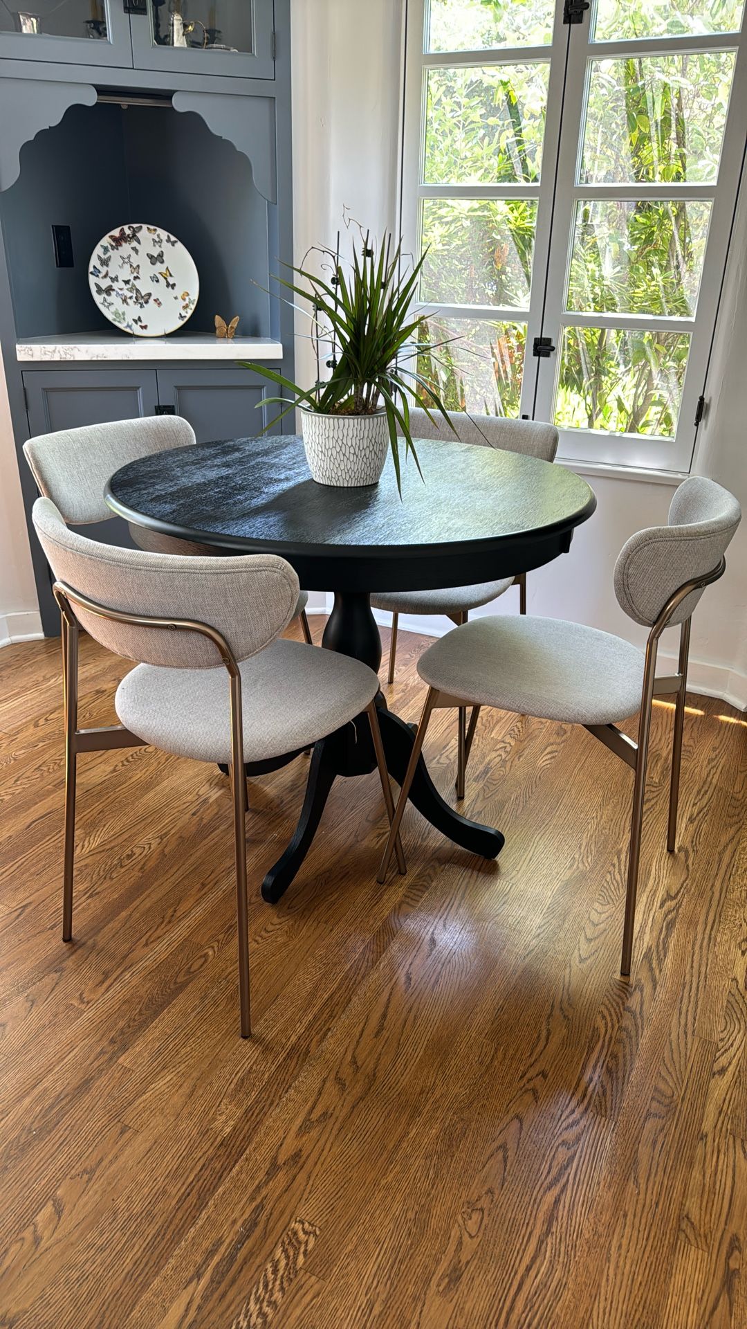This gorgeous kitchenette with dark wood round table and four beautiful light gray fabric chairs with gold legs is available for sale. Come pick up today!