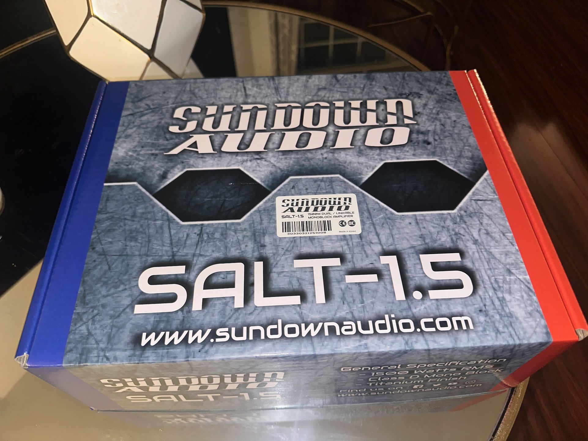 Brand new sundown audio salt 1.5 SALT Series Class D 1 ohm Stable Monoblock Amplifier RMS Power Rating: 4 ohm: 400 watts x 1 channel 2 ohm: 750 watts x 1 channel 1 ohm: 1500 watts x 1 channel Bridged: 3000 watts x 1 channel @ 2 ohm Total RMS power output: 1500 watts